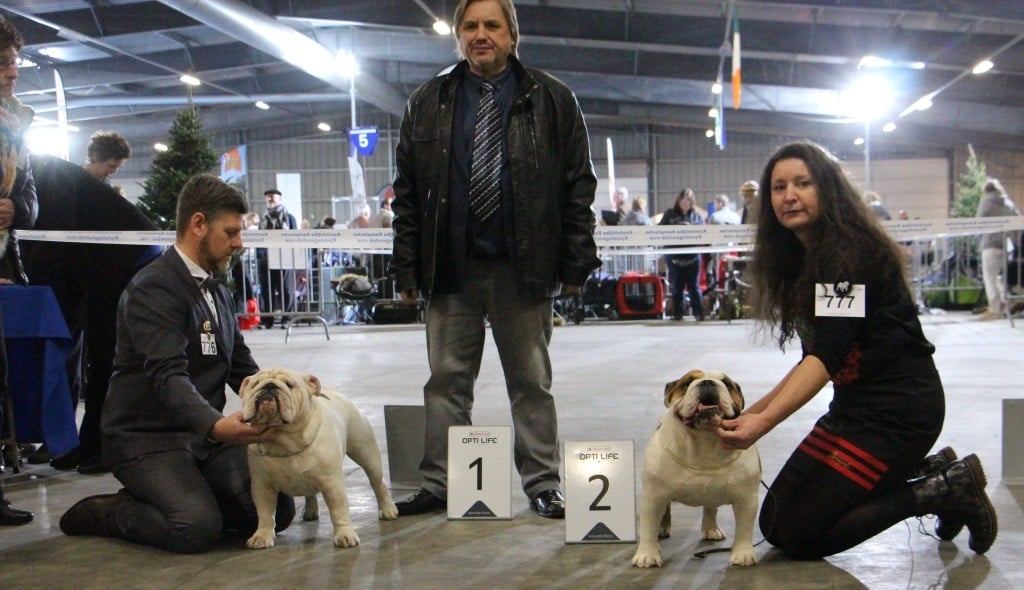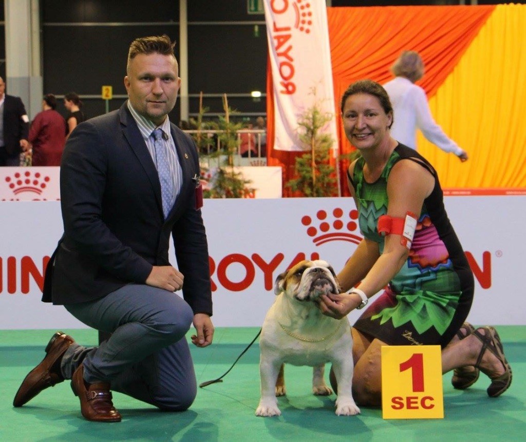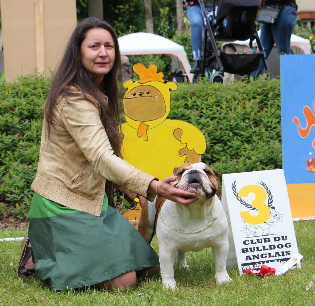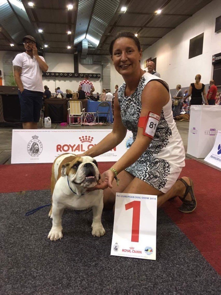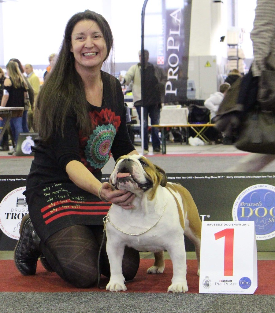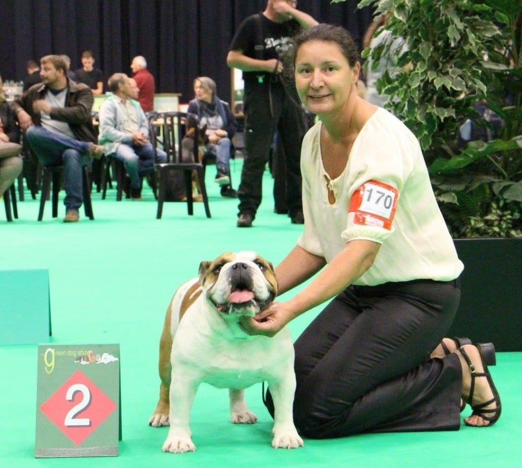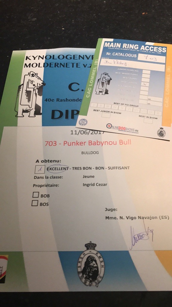 en excellente condition. Bonne ossature. Tête avec une bonne expression typique. Bon museau court et large. Bonne largeur de mandibules bonne courbure de la mandibule. bons yeux bien foncés et sain bonne oreilles en rose bien placées bonne ligne de dessus poitrine profonde et bien descendue bon aplombs av bonnes épaules bien rapportées bon arrière main queue bien placée mobile bonnes allures typique