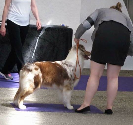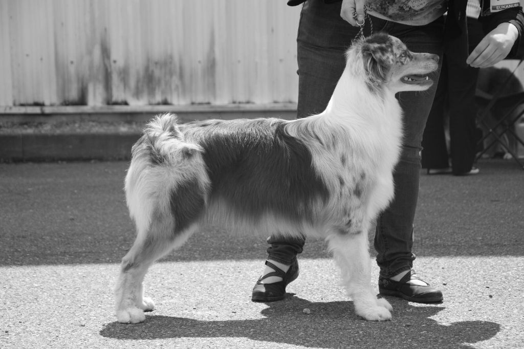 Chienne bien const.Belle tête fém.Oreilles bien porteesDentition ok Yeux Ex.Angulation Ex.Corps Ex.Poil Ex.Allures Ex. mais elle roule