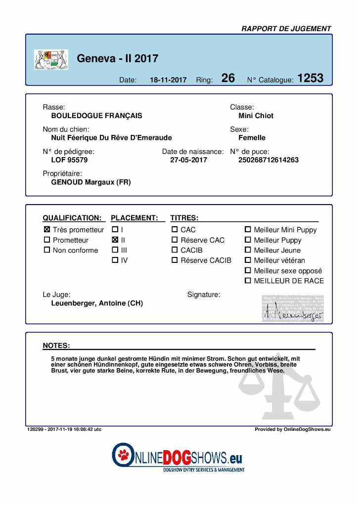 12,100Kg. 30,5cm. Chienne déjà puissante pour son âge. Très bon port d'oreilles. Excellent crâne. Tête large et carrée. Yeux de bonne forme laissant apparaître un peu de blanc autour des yeux. Excellent stop. Narines suffisamment ouvertes. Excellent prognathisme et mâchoire. Ossature solide. Excellentes côtes et poitrine. Dos solide avec léger roach-back. Queue courte. Excellent arrière-main. Un peu de laxité dans le pied. Mouvement symétrique. Allures correctes. Excellente présentation. Présentée en léger surpoids.