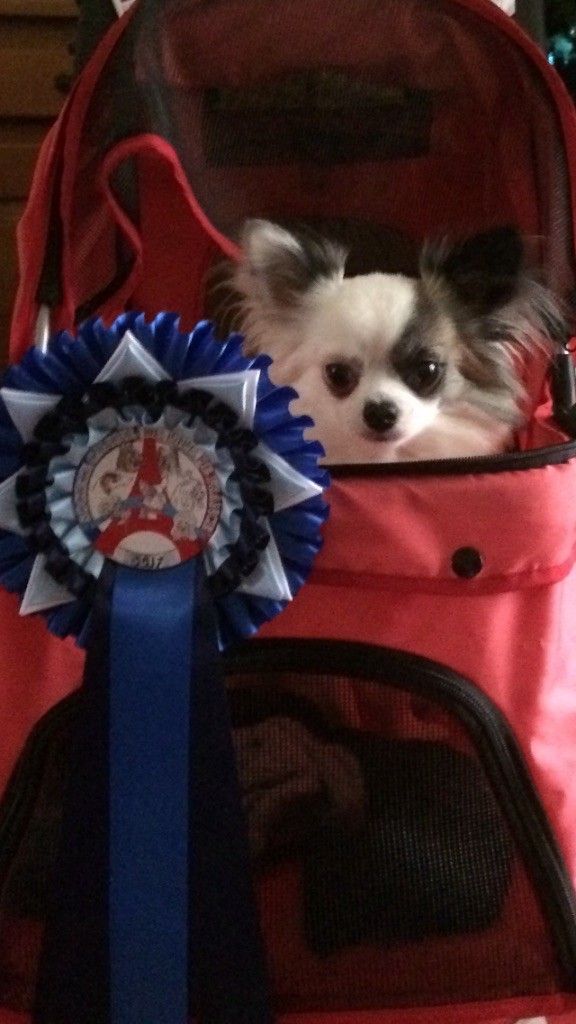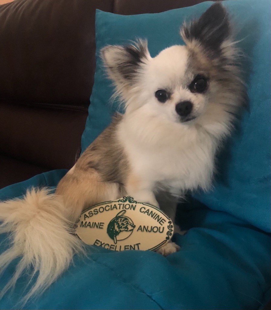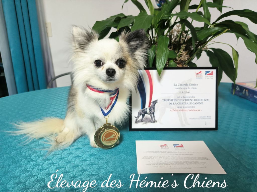 Petit étalon mais surtout premier bébé de ma belle Hémie, première portée pour moi. Quelle expérience ! Deux mâles. Je ne voulais garder que des femelles mais Massaï et Mouse sont nés et impossible de se défaire des deux. Comment choisir ? Massaï m'a mis l'évidence sous les yeux : totalement attaché à moi dès ses premiers jours, il n'y avait que moi et Hémie dans sa vie. Pour une fois qu'un chien peut choisir son maitre ! Je l'ai gardé et je regrette nullement mon choix. C'est un petit bout irrésistible que j'emmène partout avec moi, propre dès ses premiers mois, peur de rien, très sociable avec humains et animaux, il n'a rien à envier aux autres chihuahuas ! Petit mec qui suit les traces de sa maman avec les meilleurs qualificatifs en expositions. Il pèse 1.9kg tout mouillé et il est proposé en saillies externes. Très élégant dans ses allures, c'est un petit format tout en finesse très fier de lui. Vous ne pourrez que craquer en le voyant ! Test d'aptitude naturelle 10/10. Massaï est porteur de bleu, de l'extension mutée E/e, de la dilution ainsi que de la panachure moyenne. Prix de la saillie : 450euros Massaï a obtenu le titre national de chien héros en 2023 dans la catégorie médiation animale.