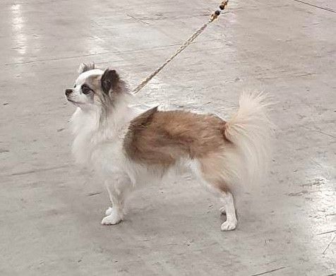 Proportions correcte.Attache de fouet bien placée.Tête suffisamment pommée.Pourrait avoir + de remplissage sous les yeux.Dentition complète ciseaux.Poitrine correcte.Se déplace bien.