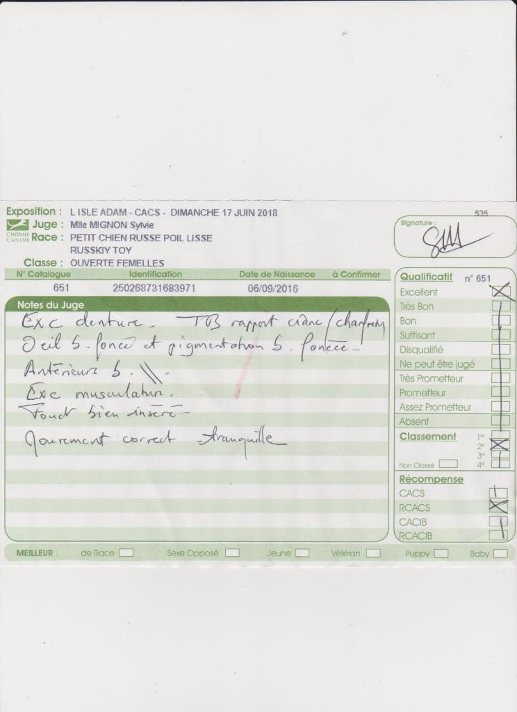 Excellente tête , Jolies oreilles , Oeil excellente forme et couleur , DCC , Excellente poitrine pour la taille , Membres parallèles , Pieds excellents en forme un peu tournés , Excellent dos , Excellent Arrière main typique , Excellente croupe , Excellent mouvement et très bon port de queue .