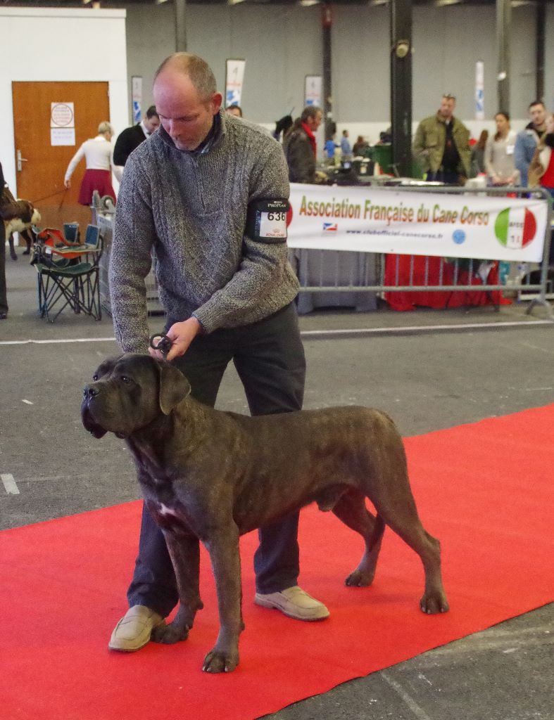 Chien dans le type, de grande tailleExc construction générale et proportion, tête bien masculine, exc. crâne stop, les yeux corrects, paupières un peu ouvertesExc. truffe, exc. denture et articuléExc. ligne du dessus, forte ossature, très bonne angulation à l'avant, Exc. à l'arrière, pieds légèrement ouvertsJarret droit a surveiller, Allures difficile, le chien ne peut pas se livrer correctement.