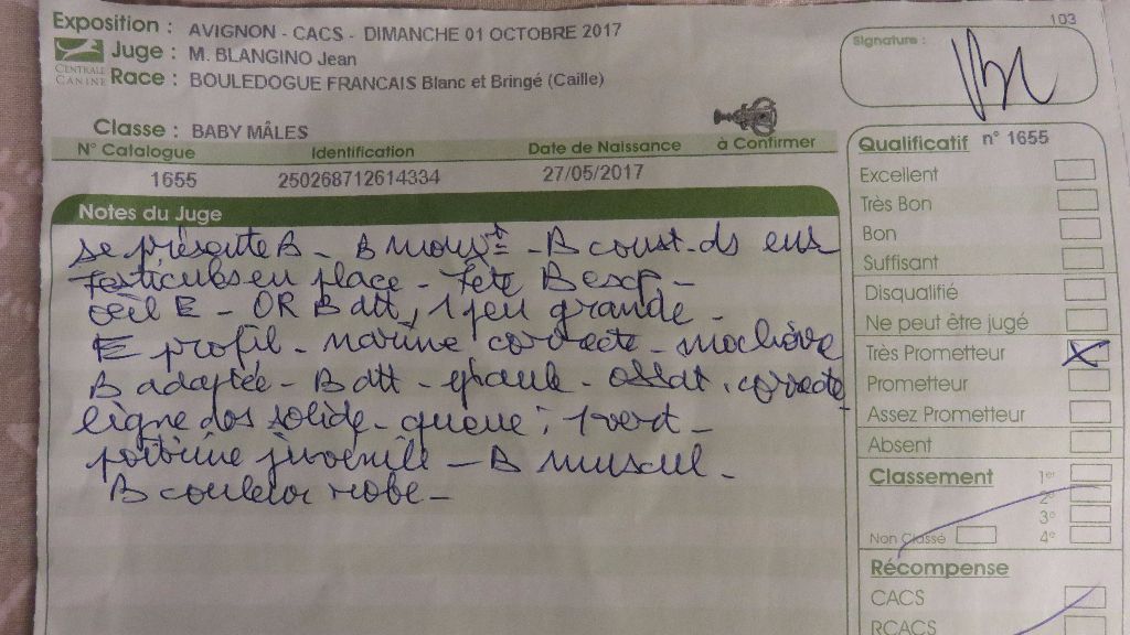 Se présente bien. Bon mouvement. Bonne construction dans l'ensemble. Testicules en place. Tête bonne expression. Oeil excellent. Oreilles bien attachées, un peu grandes. Excellent profil. Narines correctes. Mâchoire bien adaptée. Bonnes épaules. Ossature correcte. Ligne de dos solide. Queue : une vertèbre. Poitrine juvénile. Bonne musculature. Bonne couleur robe.