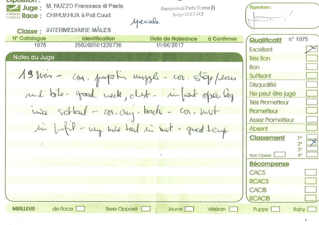 C'est un chien,avec une bonne dentition une bonne construction et ossature et surtout un caractère exceptionnel il vient prendre la relève de nos deux Champions Fripouille et G'Tadore, qui prennent de l'âge