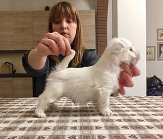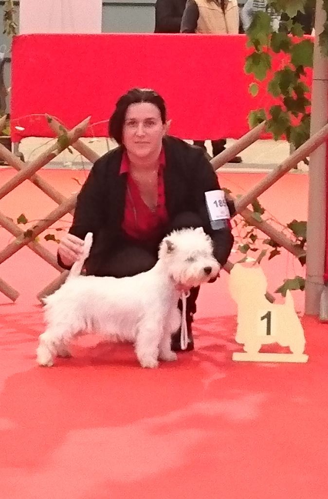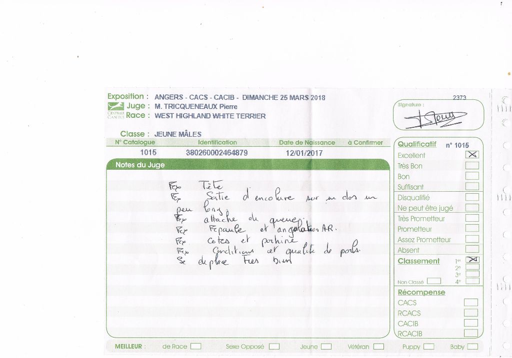 Denture conforme, Excellente tête, Oeil Foncé, Excellente pigmentation, poitrine encore juvénile, chien bien proportionné pour son âge, la poitrine doit encore descendreExcellent pied, fouet bien attaché, doit se muscler, dandine des postérieurs, chien un peu long pour le moment.Excellente ligne de dos, serre légèrement des antérieursExcellents caractère et présentation