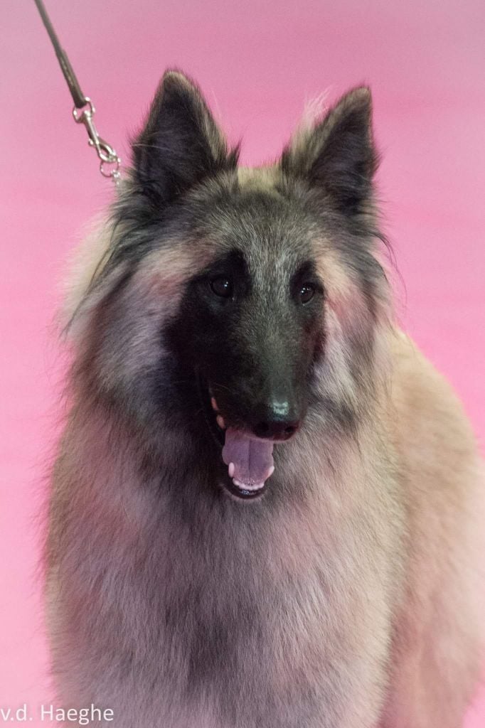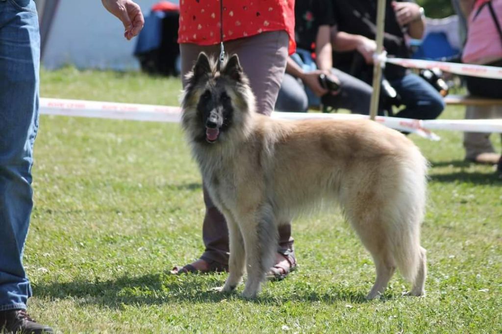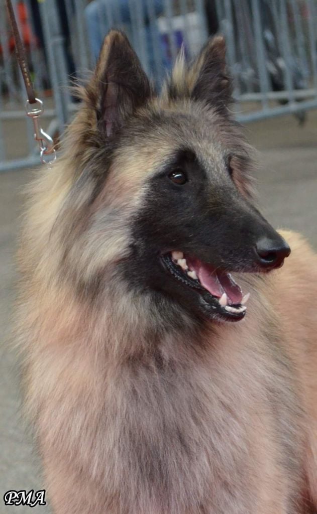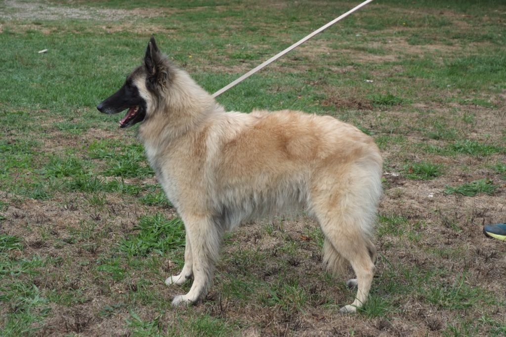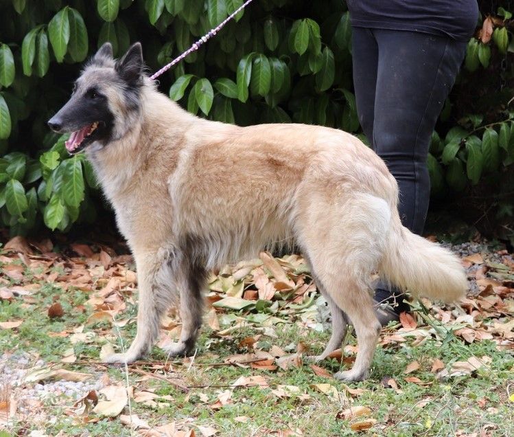 DCC, taille moyenne, jolie construction assez courte, TB angulations, belle ossature, pieds compacts, belle encolure, jolie tête féminine, sèche bien ciselée bien masquée avec bel oeil sombre, petites oreilles bien portées, bon // et stop, fourrure en mue sable charbonnée, très belles allures, bon port de fouet, joli type