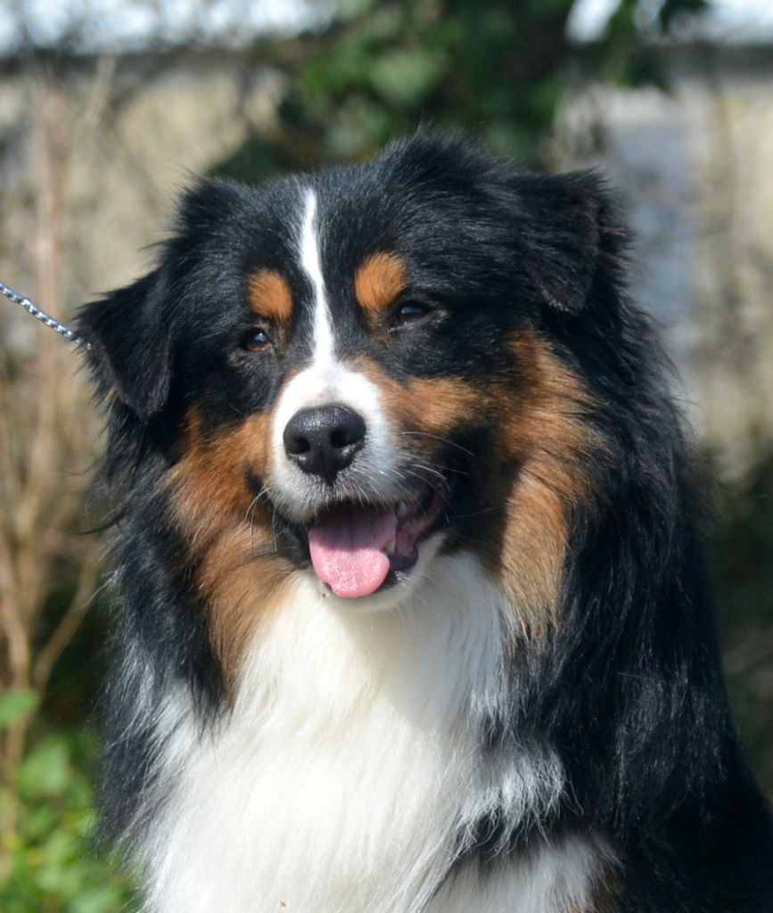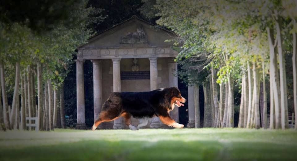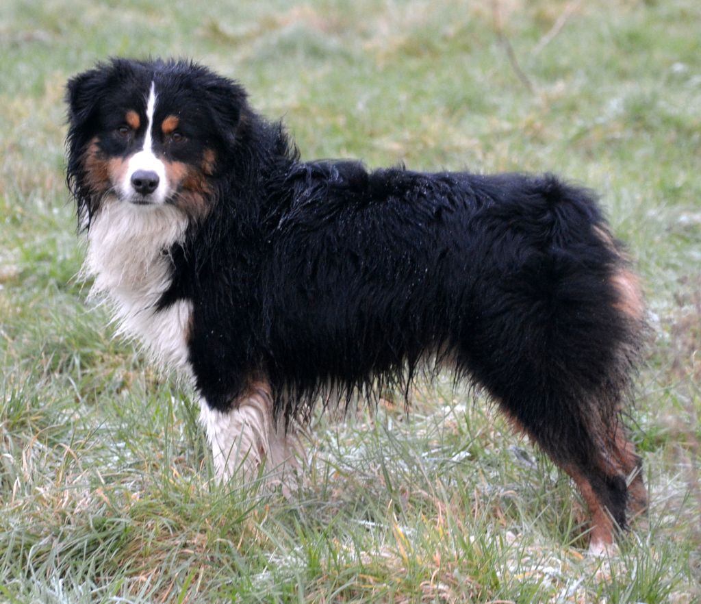 Lovely black tri male, full dentition, masculine breed type, nice shoulder lay back, level topline, correct croupe angle, nice bend of stifle, 9 mois, I would prefer a little bit more substance for a male. Garrot : 45 cmComing nice convergence on the away, nice level top line and excellent balance