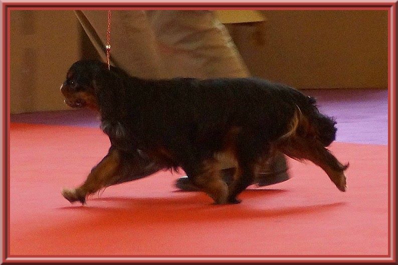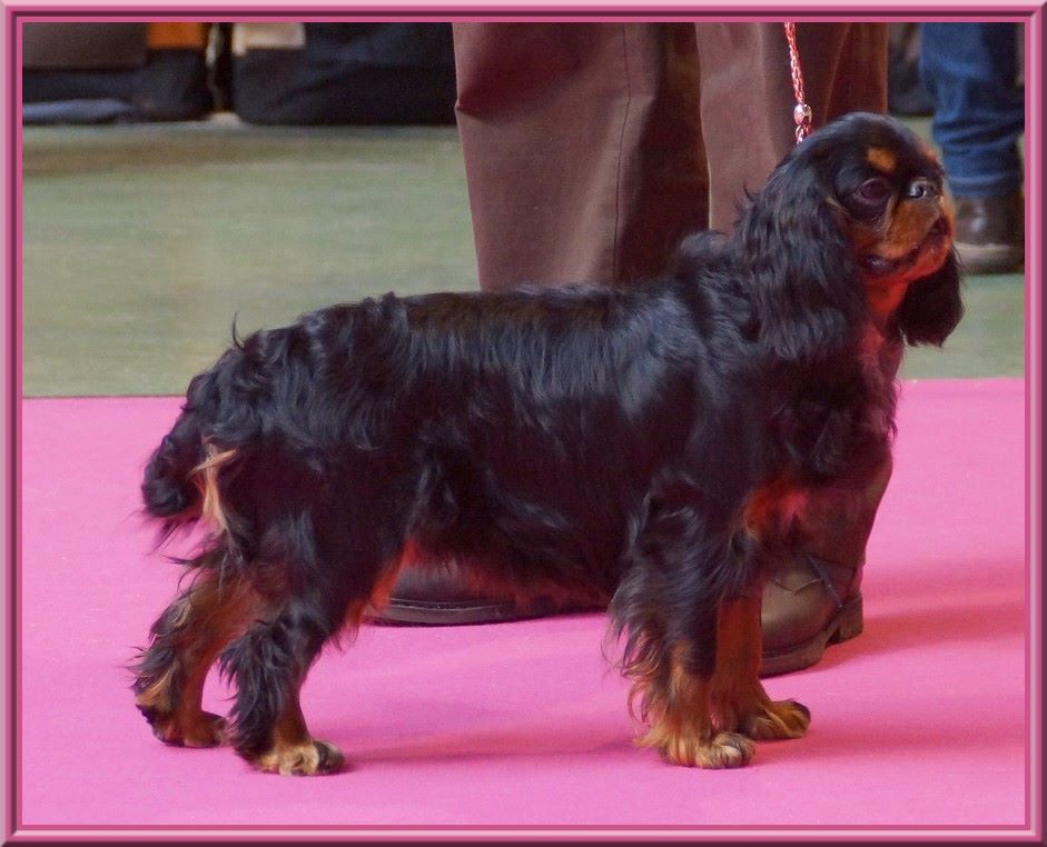 Tête féminine - Bonne dentition - Beaux yeux foncés - Bon dôme - Bonnes oreilles - Un peu de blanc au poitrail - Bonnes angulations avant et arrière - Bonne ligne de dos et poitrine - Fouet implanté un peu bas - Bonne fourrure - Exc démarche - Exc caractère (Cl. Intermédiaire)