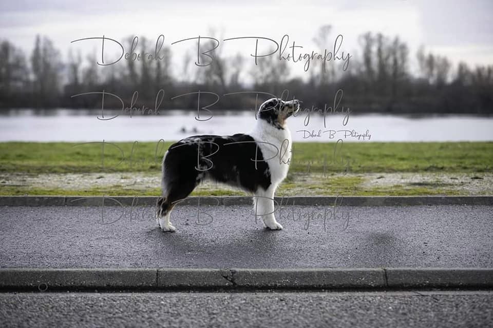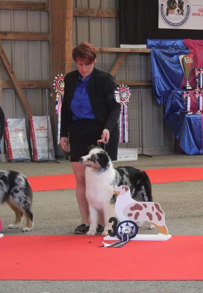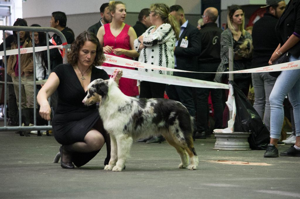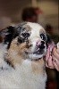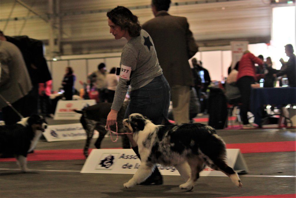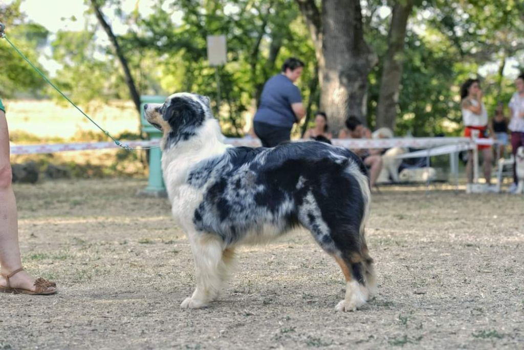 DCC - Bleue merleGrand sujet, belle construction d'ensemble.Excellente encolureTête correcte, excellent rapport crâne/chanfrein. Les oreilles sont encore un peu grandes et doivent se mettre en place, le stop doit finir de se former.Excellente épaule et très bonne avant main, poitrine correcte.Angulations arrières suffisantes, très bonne croupe.Allures correctes