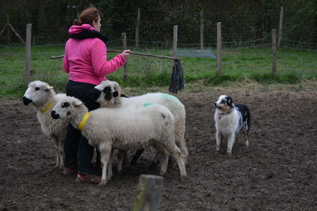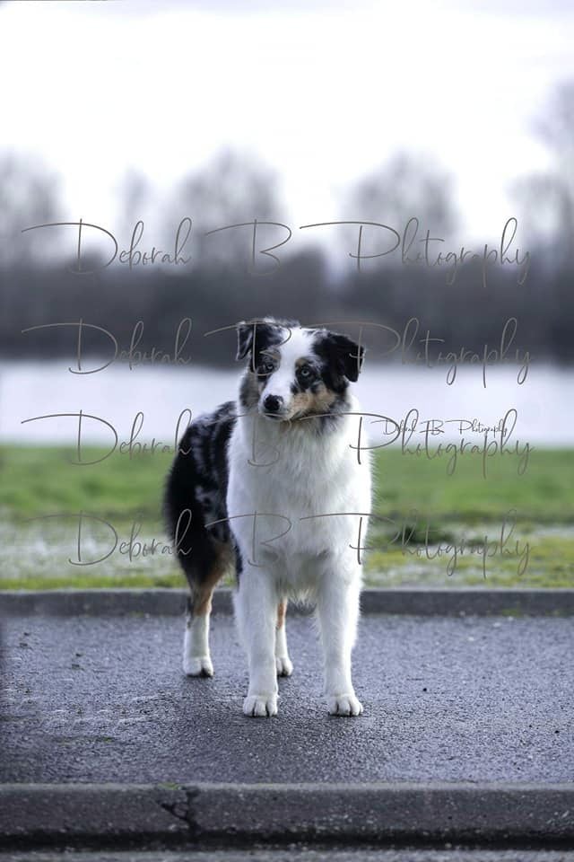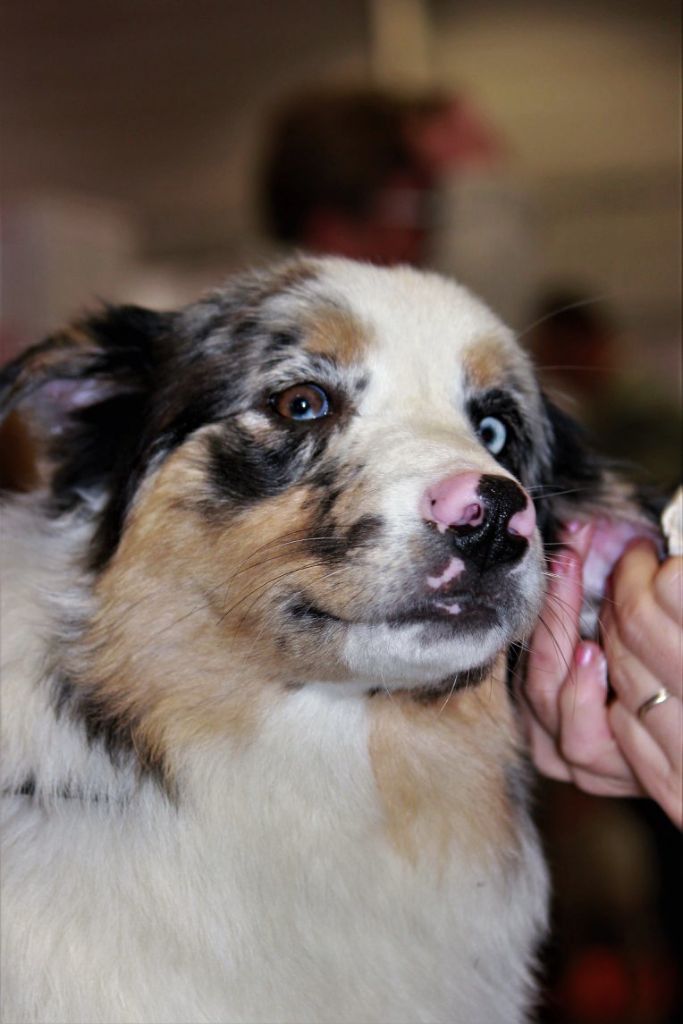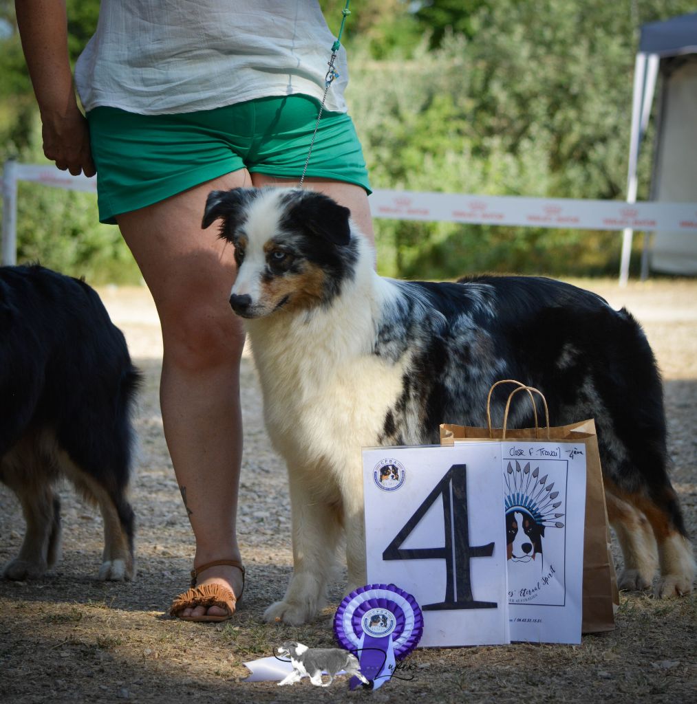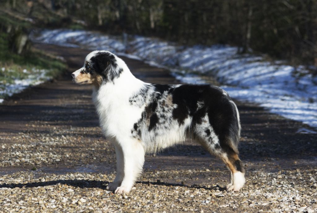 DCC - Bleue merleGrand sujet, belle construction d'ensemble.Excellente encolureTête correcte, excellent rapport crâne/chanfrein. Les oreilles sont encore un peu grandes et doivent se mettre en place, le stop doit finir de se former.Excellente épaule et très bonne avant main, poitrine correcte.Angulations arrières suffisantes, très bonne croupe.Allures correctes