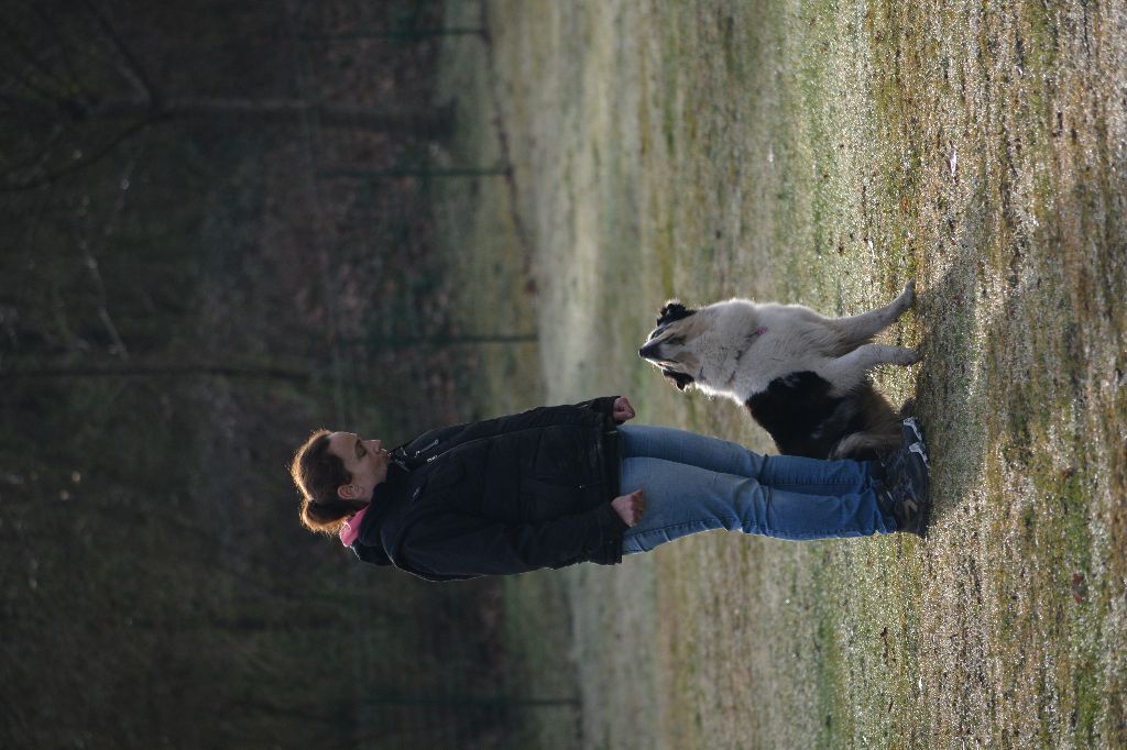 Chienne active et intéressée. Contrôle et gère le troupeau, Bonnes aptitudes bergères