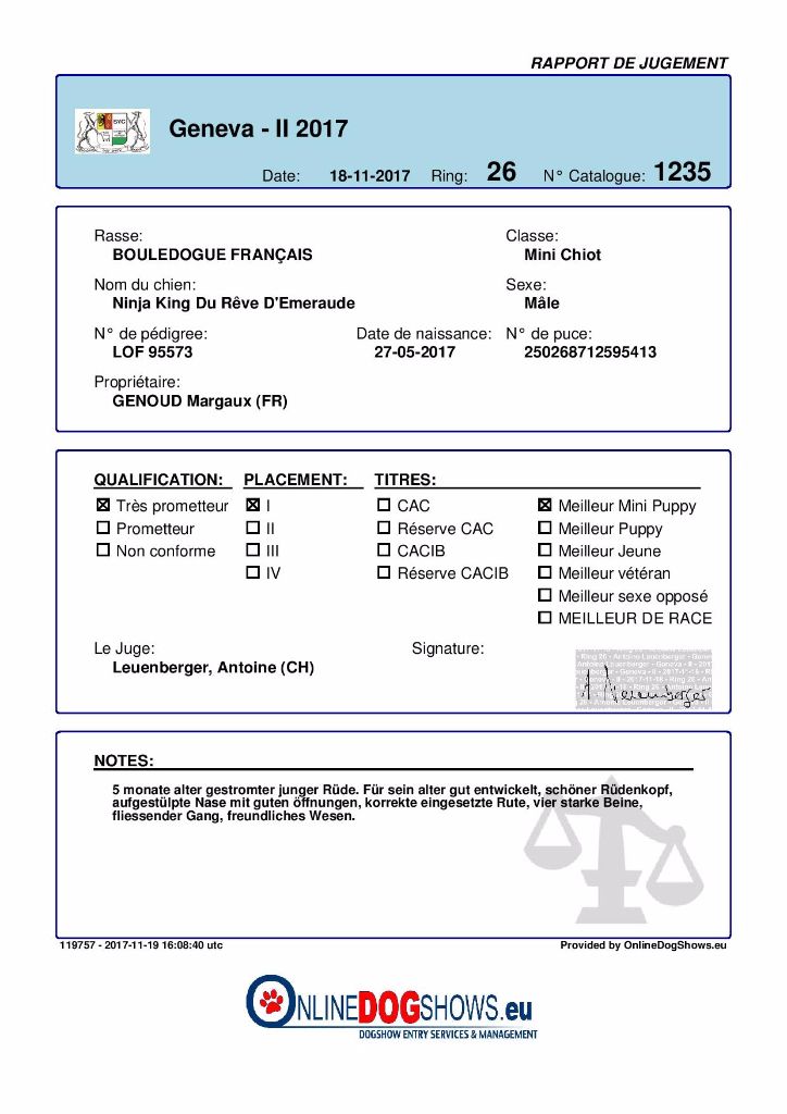 Ninja King a été sélectionné parmi les 8 premiers sur le ring d'honneur, par Monsieur le juge, Rafael de Santiago (Président de la Fédération Cynologique Internationale).
