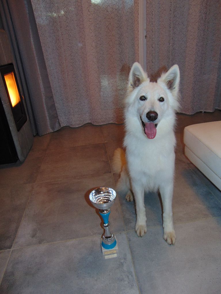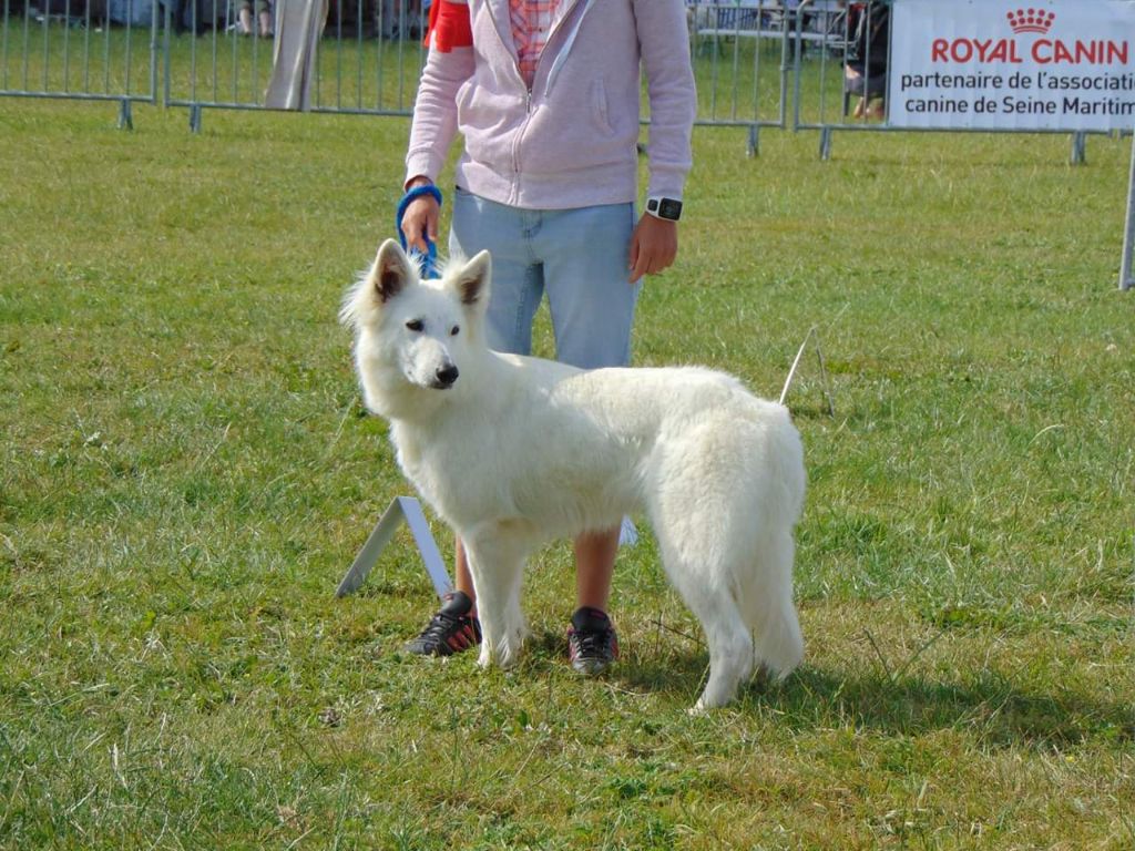 " Dentition complète en ciseaux, sujet féminin, excellente ligne de dos et proportion crâne. Très bon ?il, forme et couleur. Excellente pigmentation truffe et lèvres. Oreilles bien placées mais crâne suffisamment large. Belle encolure et ligne de dos. Ossature moyenne. Mouvements réguliers et excellentes amplitudes"