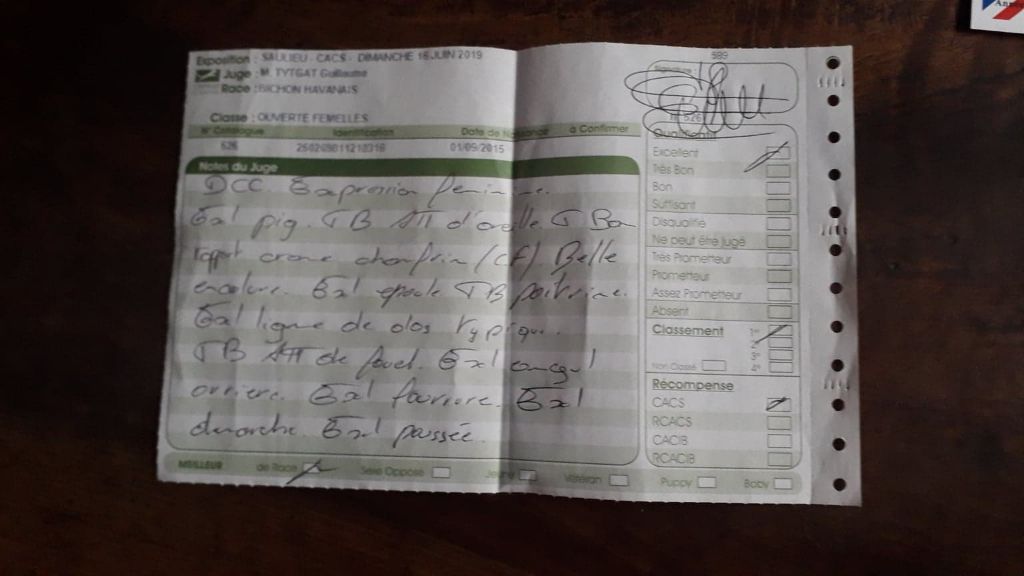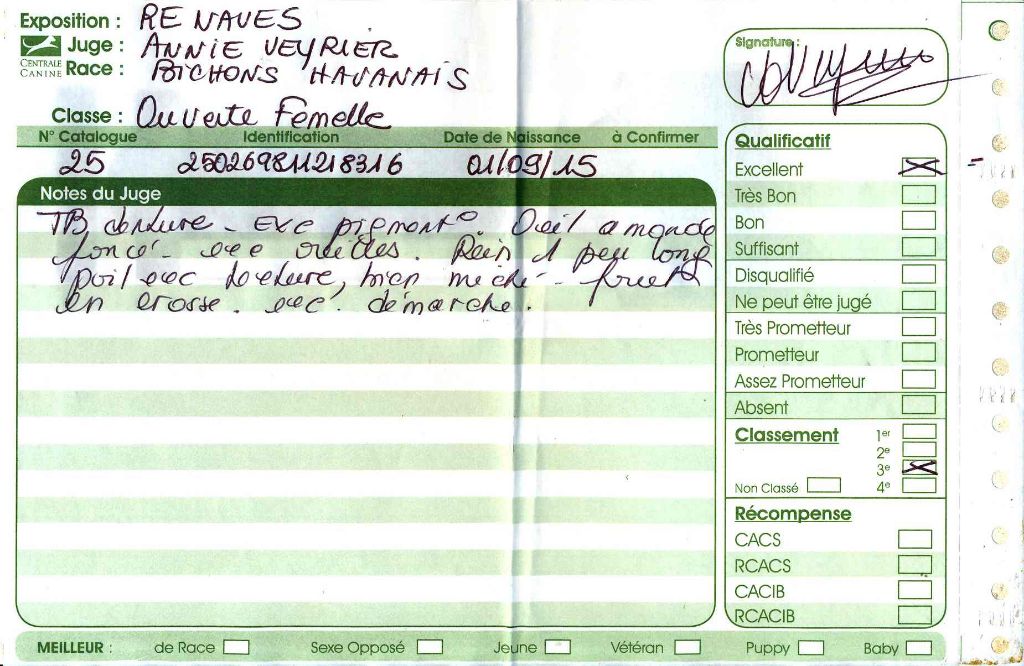 Quand on veut vraiment insulter un éleveur...En poussant le vice jusqu'à tendre le carton excellent, se raviser, retourner au secrétariat et faire changer le qualificatif...Donc....J'annule sa participation à la Nationale d'Elevage et lui offre au contraire une carrière internationale, avec des juges du monde entier, indépendants...très loin de ce juge sensé représenter qui plus est un Club dont l'objet est la promotion de la race... Triste Constat.Mais parfaite réplique du barrage infligé à Gentille MogwaÎ la plus grande championne havanaise de France... toujours par les même réaction épidermique de compétiteur déçu ??? Oh que non ! Les résultats et slips de commentaires sur plus de dix ans attestent parfaitement cette volonté de dénigrer régulièrement mes chiens.Au final, les commentaires de dizaines et de dizaines de juges étrangers, certains fort connus, ne font que ....ridiculiser pareil comportement honteux.