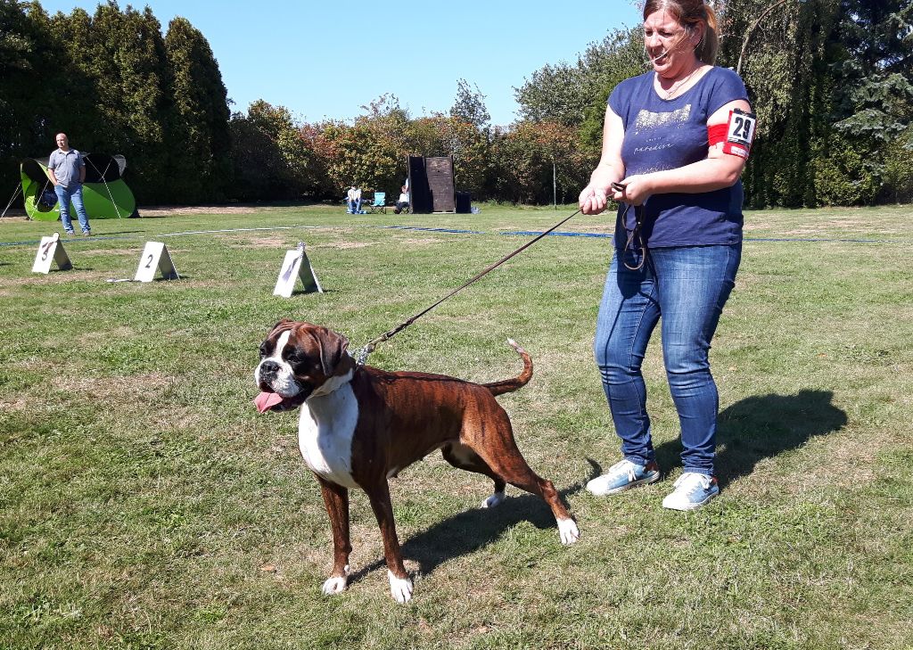 grande,bringé doré avec joli marquage blanc, tête pleine et typique du boxer, parfaite expression, exc forme de crâne , museau plein et large ,yeux et masque foncés, aurait aimé une dentition un peu plus large,construction carrée tres bien proportionnée, qui va encore se renforcee avec l âge, parfaite encolure ,tres belles lignes du dessous et du dessus ,tres belles angulations avant et arriere ,cuisses larges et qui doit encore se muscler ,allures avec tres bonnes poussées.