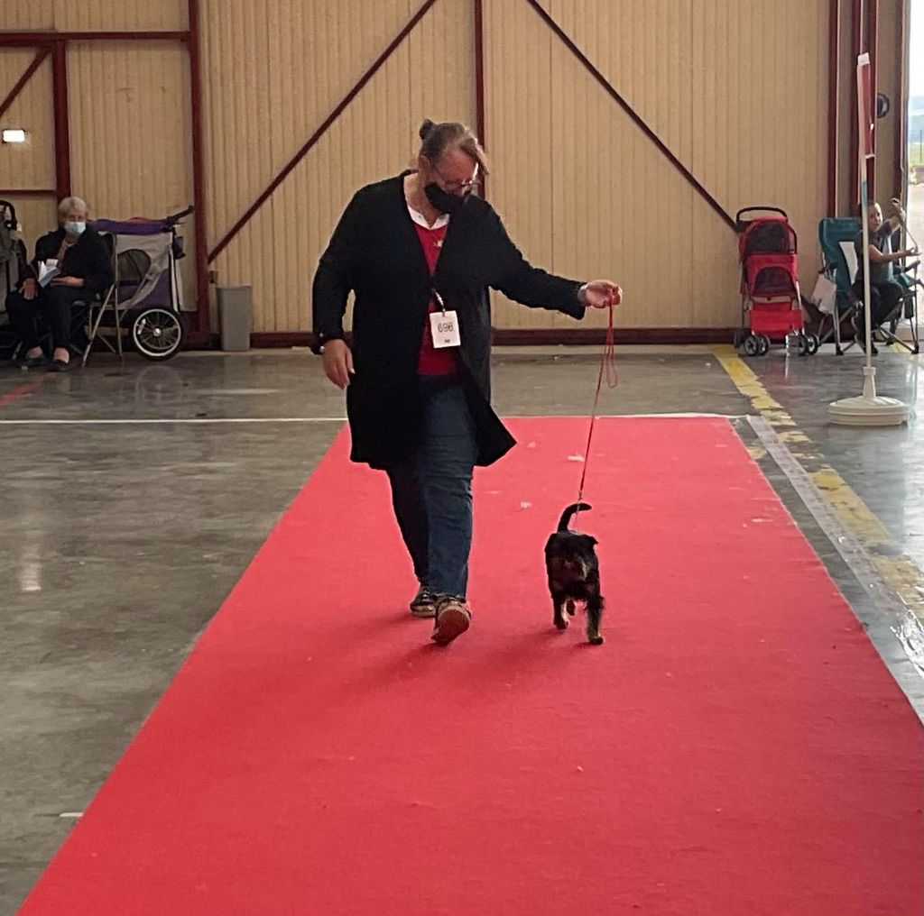 ex machoire en berceau, ex bouche truffe large narine bien ouverte petite bien placée oeil foncé et rond ex largeur crâne antérieur bien droit avec joli pied chat ex poitrine ex couleur bien tranché noir/feu ex dureté du poil ex angul AR présentation timide