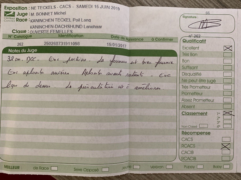 Dentition complète. Excellente ossature. Bonne construction. Tête très féminine. Excellente fourrure. Bonne pigmentation. Bonne angulationConfirmée kaninchen. Présentation un peu timide.