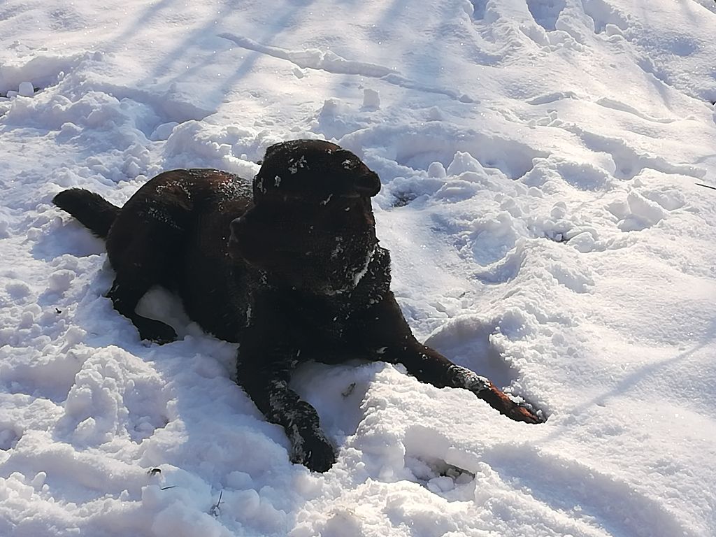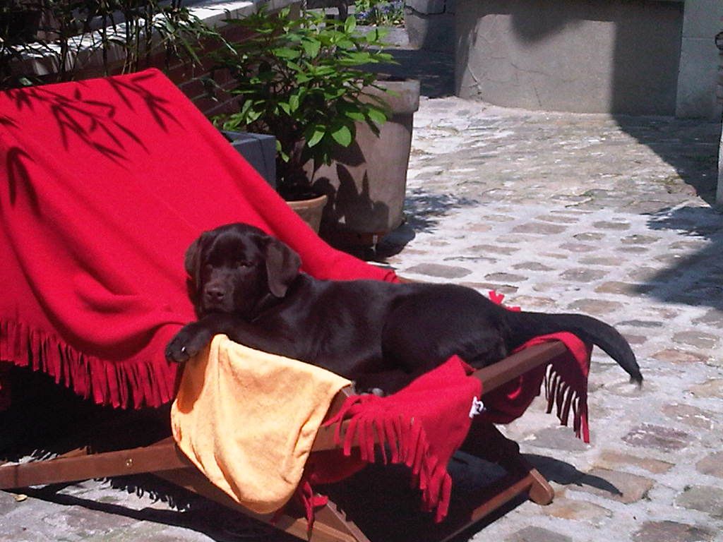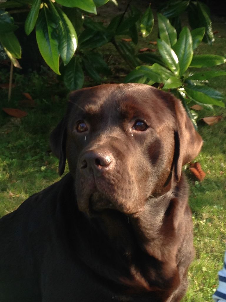 Physique : robe chocolat foncé avec reflets caramel. Yeux mordorés. On dit souvent de moi que je n'ai pas le physique classique du labrador « d'exposition », mais plutôt celui du labrador « de sport » : silhouette affûtée (fin et musclé), ossature robuste (tête carrée et poitrail développé), et un regard doux et expressif (paupières qui ne tombent pas sauf si je suis KO). Peu de sous poil. Pas de dysplasie (radio de contrôle effectuée)et yeux OK.