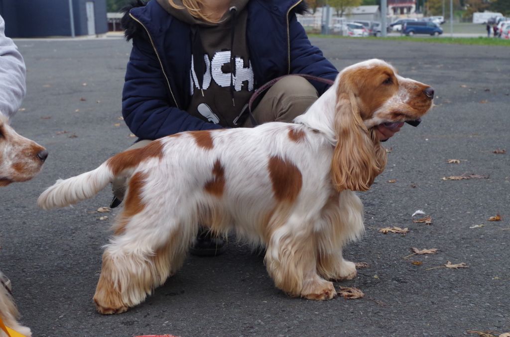 22 mois blanc et orange DCC, un peu timideexcellente construction d'ensemble puissante, pigmentation correcte pour la couleur.Excellente attache d'oreilles,excellente ossature, applombs,épaule. La poitrine doit se développer.Rein un peu long.excellente attache de fouet,et arrière mainExcellente qualité et quantité de fourrure.La ligne de dos pourrait être plus soutenue.Excellente démarche