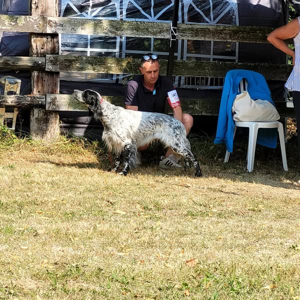 DCC, bien dans le rectangle.Excellent modèle, parfait dans le type recherché.Excellents parallélisme, couleur oeil, sortie d'encolure, dessus, poitrine. Epaule parfaite. Belle arrière main, belle soie. Chien très équilibré, très bonne présentation, excellent dans le mouvement. MEILLEUR DE RACE
