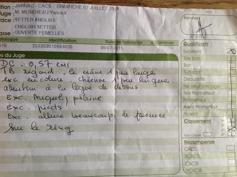 Tête dans type de race, mais qui manque de stop. Le chanfrein devrait être plus carré, corps dans le rectangle, épaule un peu droite, ligne dorsale correcte, mais croupe un peu courte et avalée. a l'allure ouvre les coudes, mouvement souple.