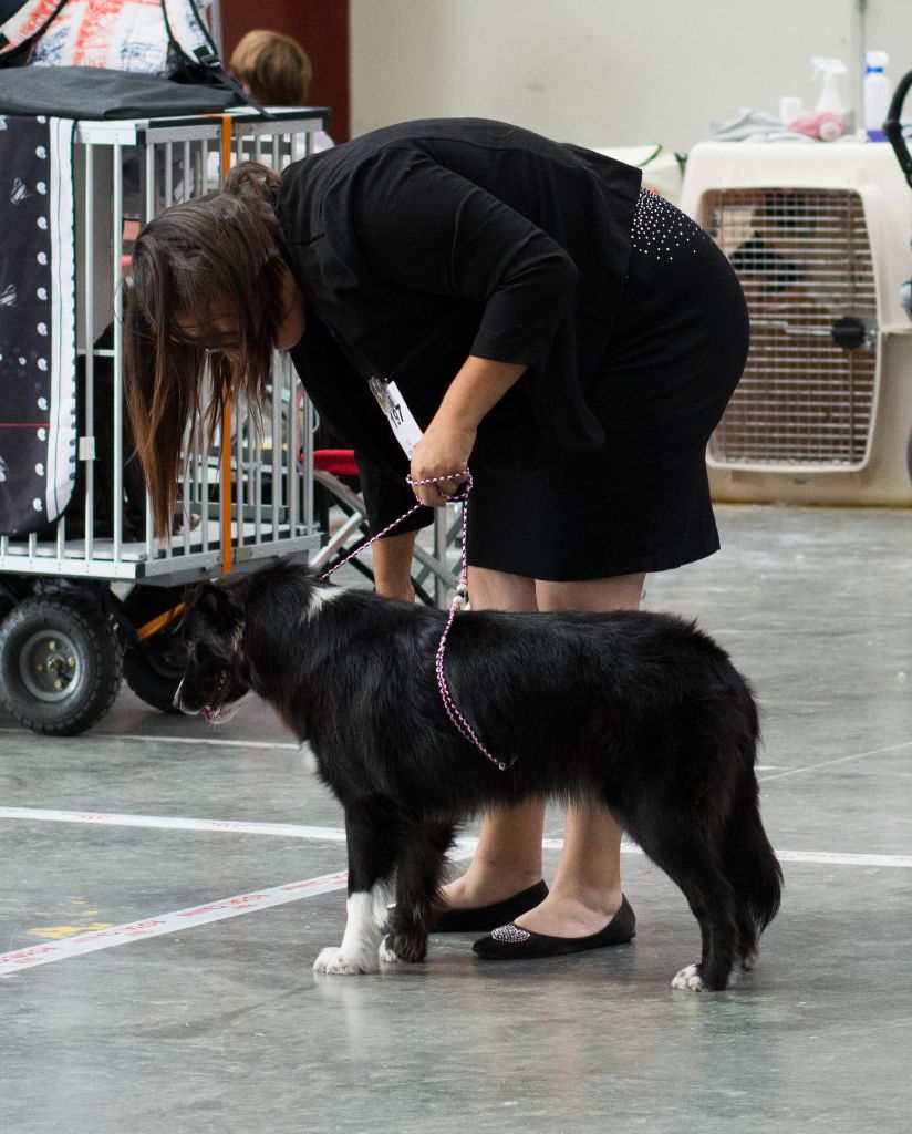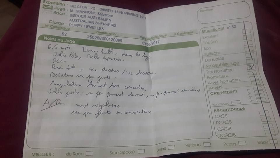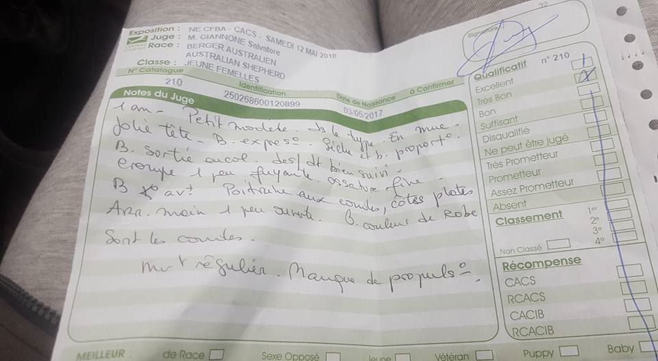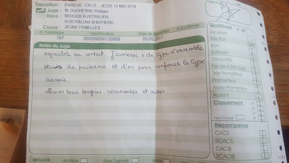 Agreable au contact. J'aimerai + de type d'ensemble. Plus de puissance et d os pour renforcer le type aussie. Allures bien bergeres. couvrantes et aisées