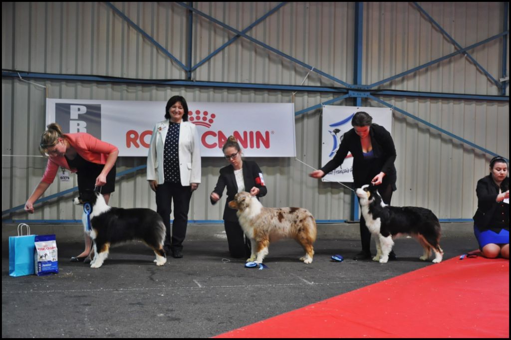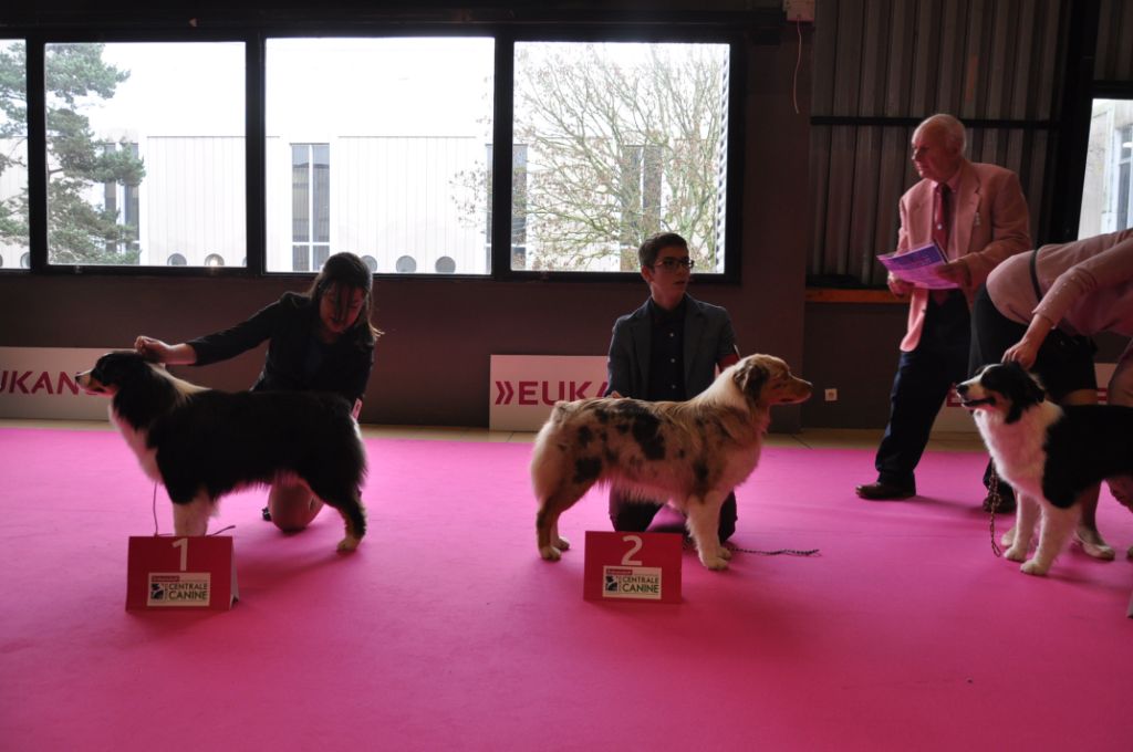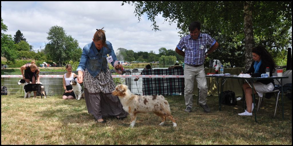 Classe intermédiaireExcellent type et gabarit bien proportionnée exc ligne du dessus et exc poitrineexc épaules et aplombs bien// tête exc, oeil un peu trop rondexc mouvements souples et amples