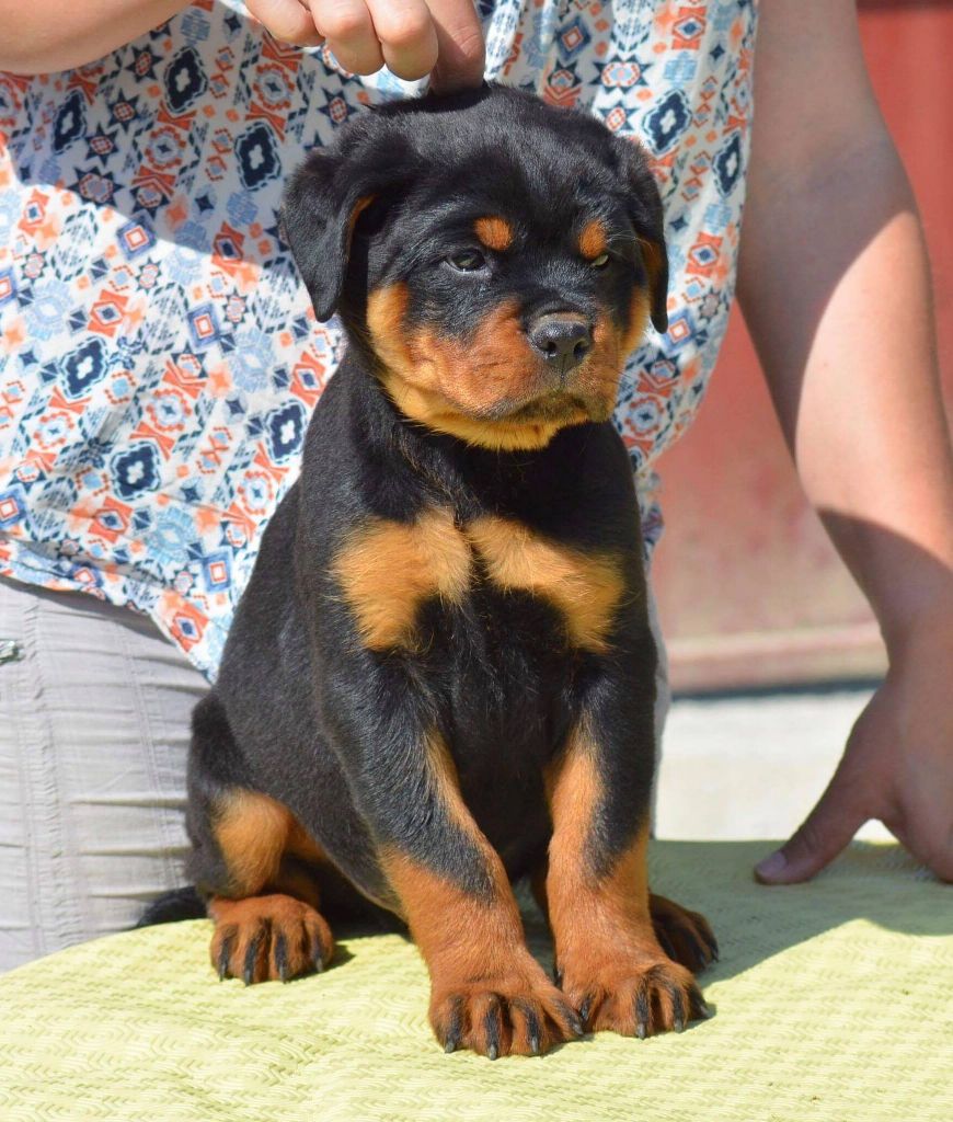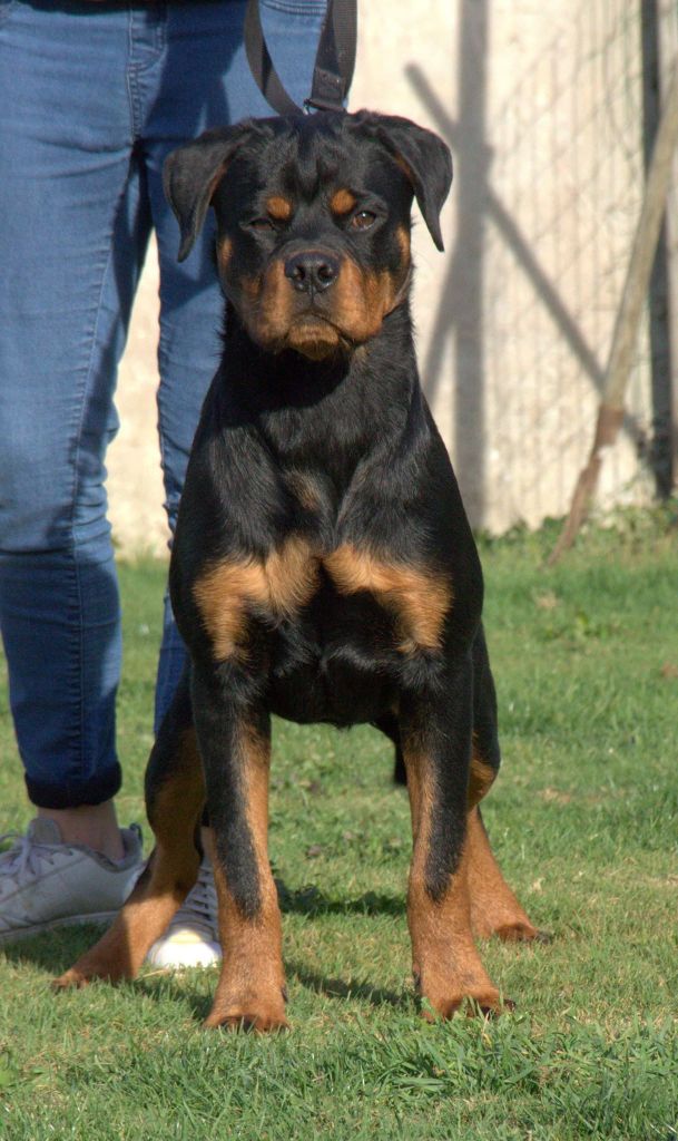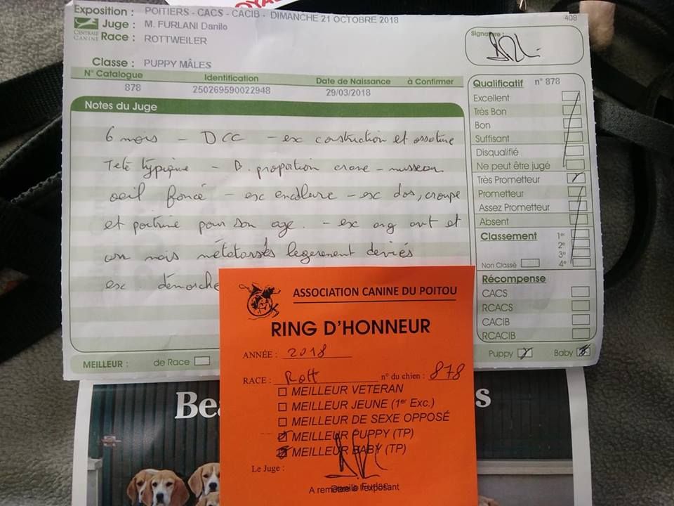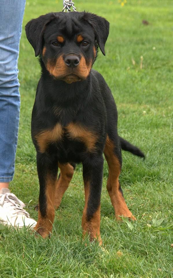 4 mois bonne fermeture en ciseaux dents en cours, bonne taille et formatTrès bonne ossature tête bon profil, oreille un peu haute oeil marronbonne forme de museau angulation avant correct l'homoplate pourrait être plus haute poitrine bien descendue, rein correctfouet bien porté, très bon aplmombs arrière, très bonnes allures de bébé harmonieuse pieds encore plat