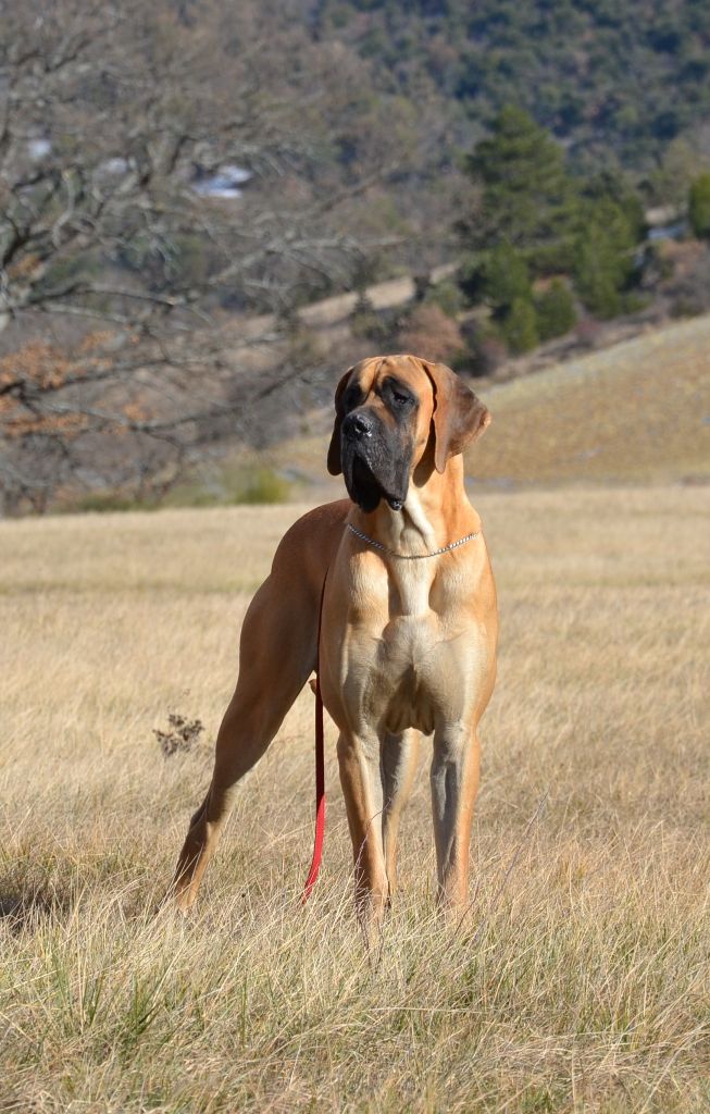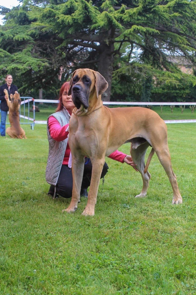 Grand chien puissant élégant. Tête de longueur correcte, EXC rapport crâne chanfrein, stop un peu osseux, yeux de bonne couleur, paupières saines, EXC truffe,EXC denture et articulé. Encolure de bonne longueur, EXC galbe, un peu chargée, EXC ligne de dessus, bonne longueur de fouet, EXC poitrail, EXC ossature, EXC angulations avant, TB à l?arrière. Membres bien parallèles. Déplacement sans problème. Très jolie couleur. EXC caractère.