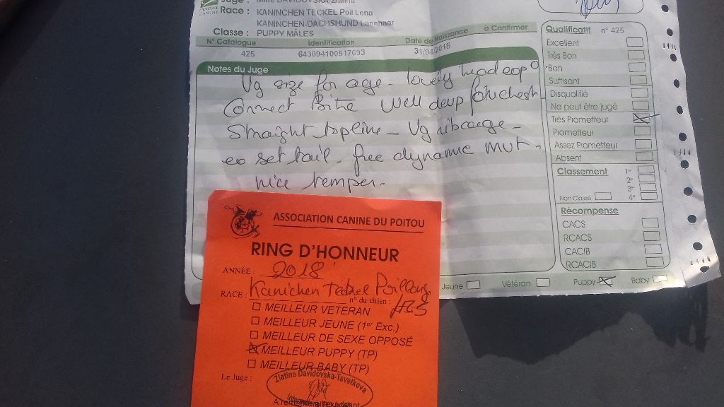 15 mois, tête correcte, bon oeil sortie d'encolure et ligne de dos, démarche dégagées, bon port de queue. Exc fourrure, bon caractère.