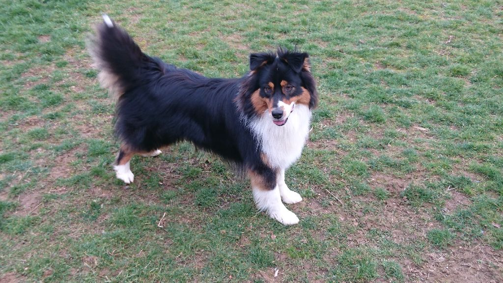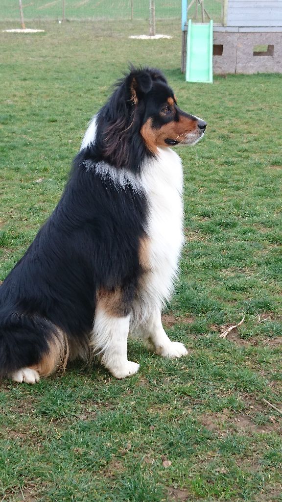 Issu d'une grande lignée de chiens de concours primés sur plusieurs générations (pédigrée complet disponible sur le site de la SCC), d'une mère bleue merle et d'un père rouge tricolore.