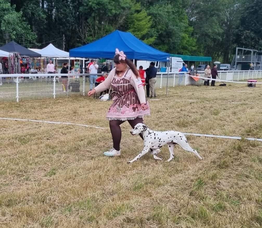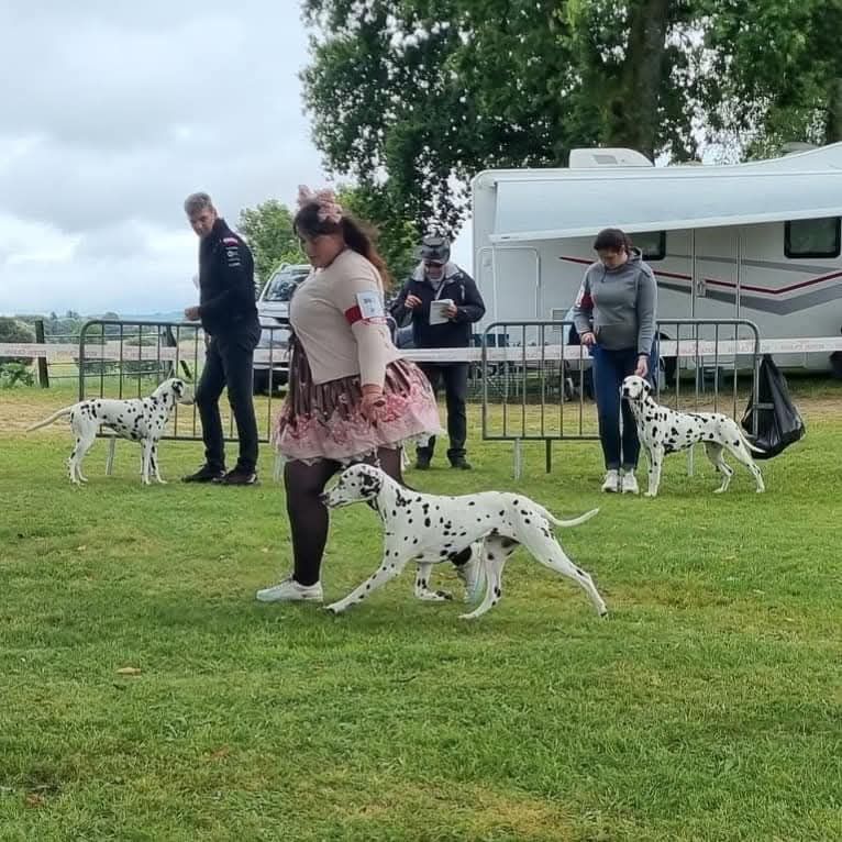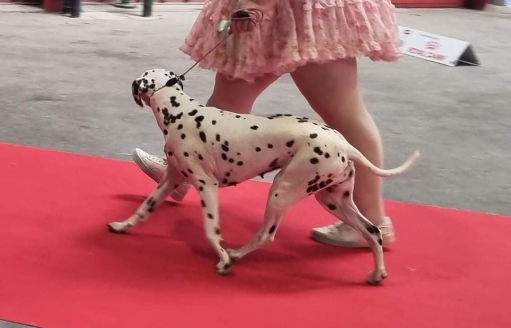 - Mathieu: Couple homogène au point de vue type, on voit bien la différence entre le mâle et la femelle, attention au mouvement ne pas avoir la femelle en avant par rapport au mâle. - Samuel: Joli couple de dalmatiens foie, assez légèrement tachés. Construction sérieuse mais un légermanque d'ossature.Mouvement agréable à regarder et très bonne présentation.