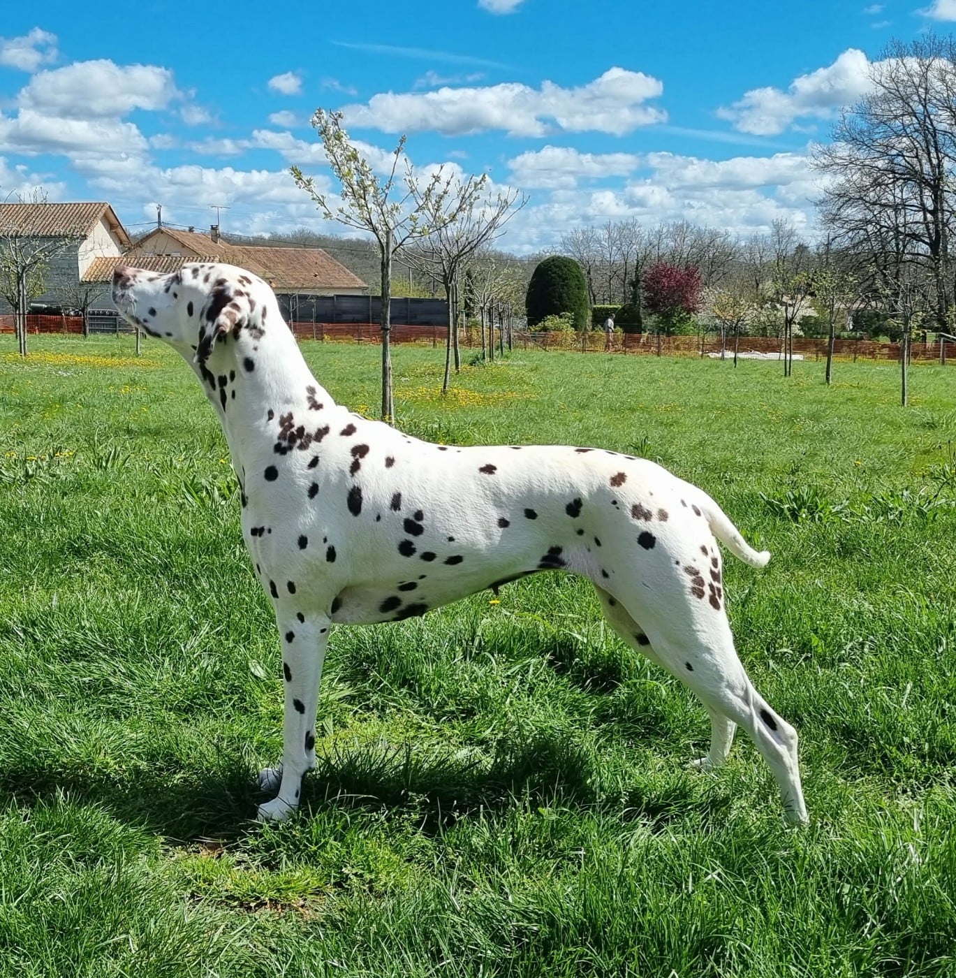 "Dentition Complète En ciseau. Excellent crâne, Stop, Chanfrein. Oreilles bien insérées. Excellente forme de côtes. Très bonne épaule. Les tâches mériteraient d'être plus nombreuses. Très bonne ligne de dessus."