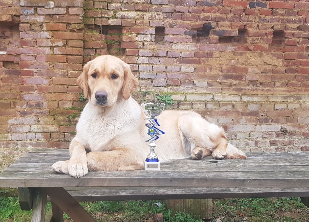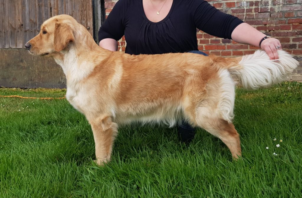 4 mois - Jolie tête féminine - yeux foncés - oreilles bien attachées - TB poitrine - TB angulation AV/AR - ligne dos soutenue - queue bien attachées / portée- mouvement actif - belle couleur de robe golden