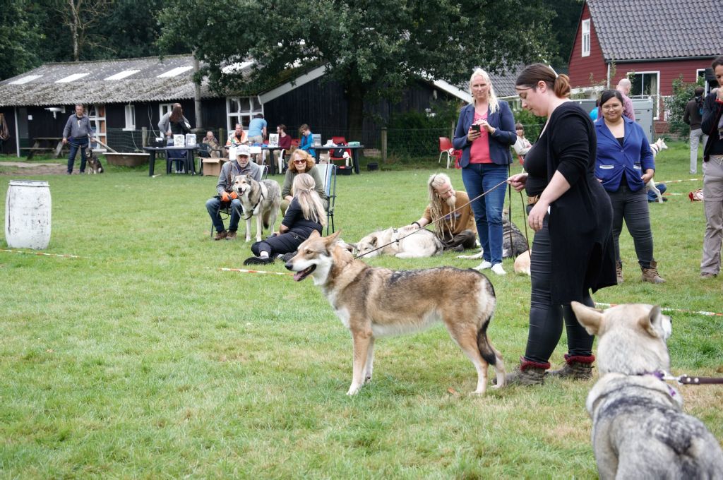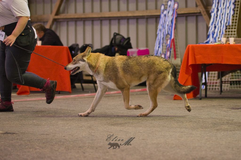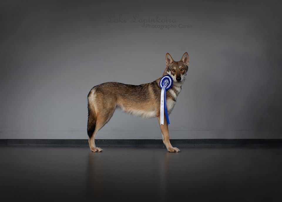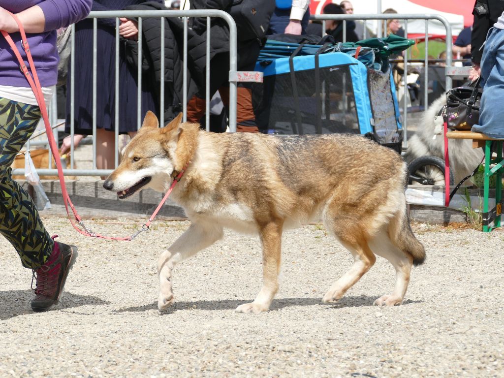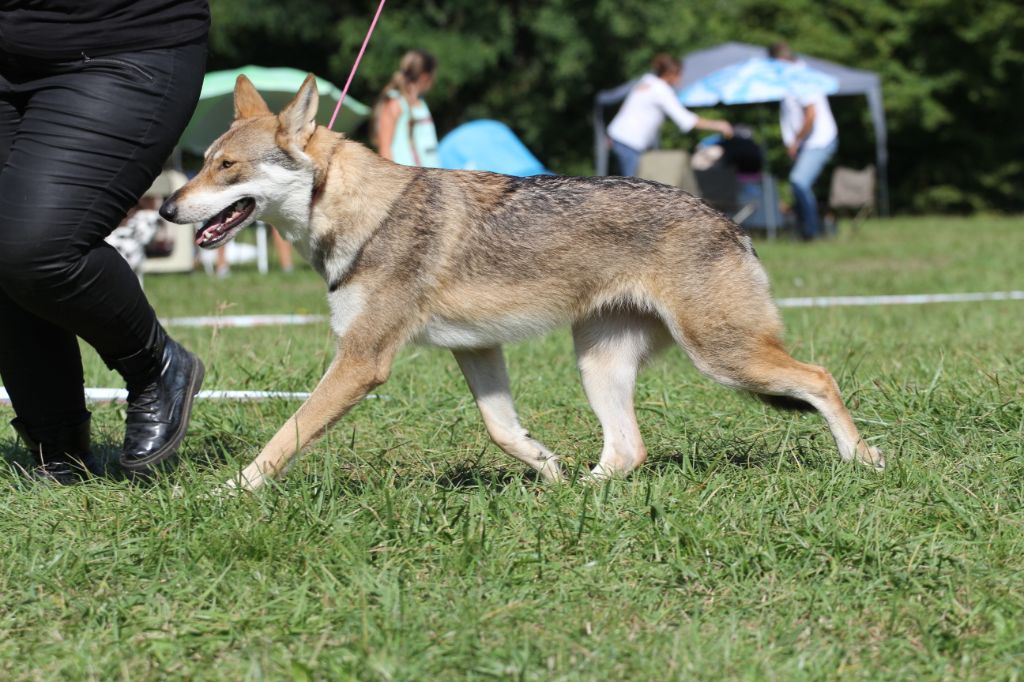 DCC. Gris de loup. Déjà bien construite. Excellente ossature et angulations. Poitrine bien descendue. Poitrail d'excellente largeur. Belle encolure. Tête longue et expressive. Excellent Oeil. Très bonnes oreilles. Excellent mouvement. Tête bien portée.