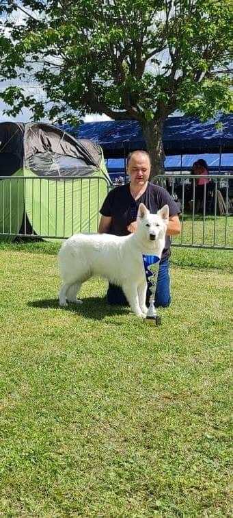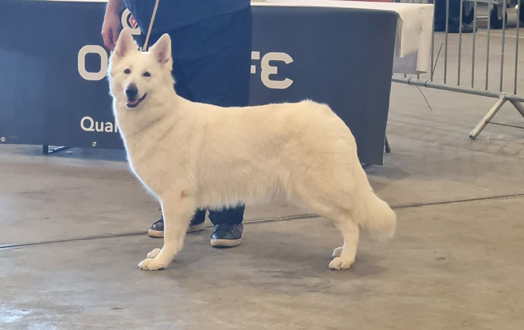 Jolie chienne, Bien proportionnée, Bonne forme de tête, DCC, Excellente pigmentation, Lèvre bien sèche, Bonne épaule, Bons aplombs, Bonnes angulations arrière, Bonne démarche bergère avec bonne extension