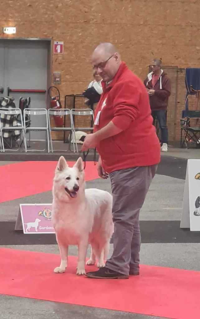 DCC, Jolie tête ciselée, Bon parallélisme et stop, Belle oreille, Oeil assez soutenue dans la forme, Belle encolure, Corps dans le rectangle, Très bon dessus, Angulation correct, Bon aplomb et pied, Belle ossature, Chienne calme et tranquille, Belle présentation et allure, Beau mouvement, Poitrail un peu large, Très belle allure avec Bon port de fouet