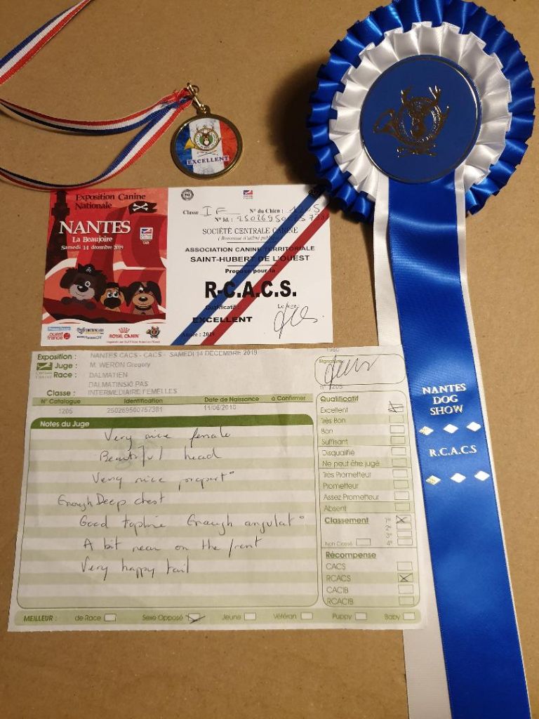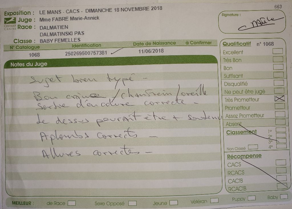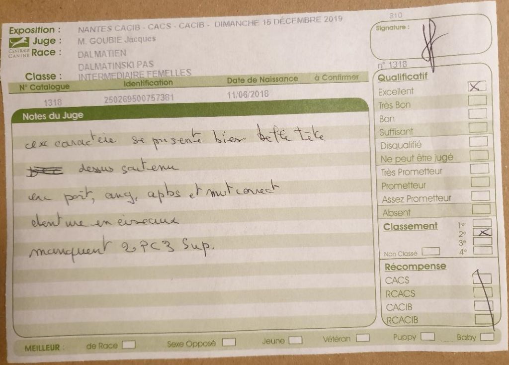 Bon format. Jolie chienne. Bonne tête. Oreilles bien attachées. Excellents aplombs avant. Bon poitrail et poitrine. Bonne angulation arrière. Très joyeuse. Serre beaucoup à l'arrière. Manque un peu de poussée à l'arrière