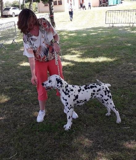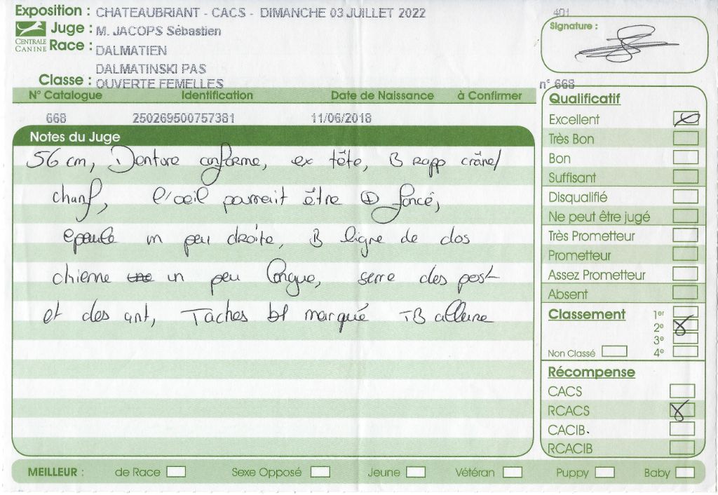 56 cm. Denture conforme. Excellente tête. Bon rapport crâne/chanfrein. L'oeil pourrait être plus foncé, épaule un peu droite, Bonne ligne de dos. Chienne un peu longue. Serre des postérieurs et des antérieurs. Tâches bien marquées. Très bonnes allures.