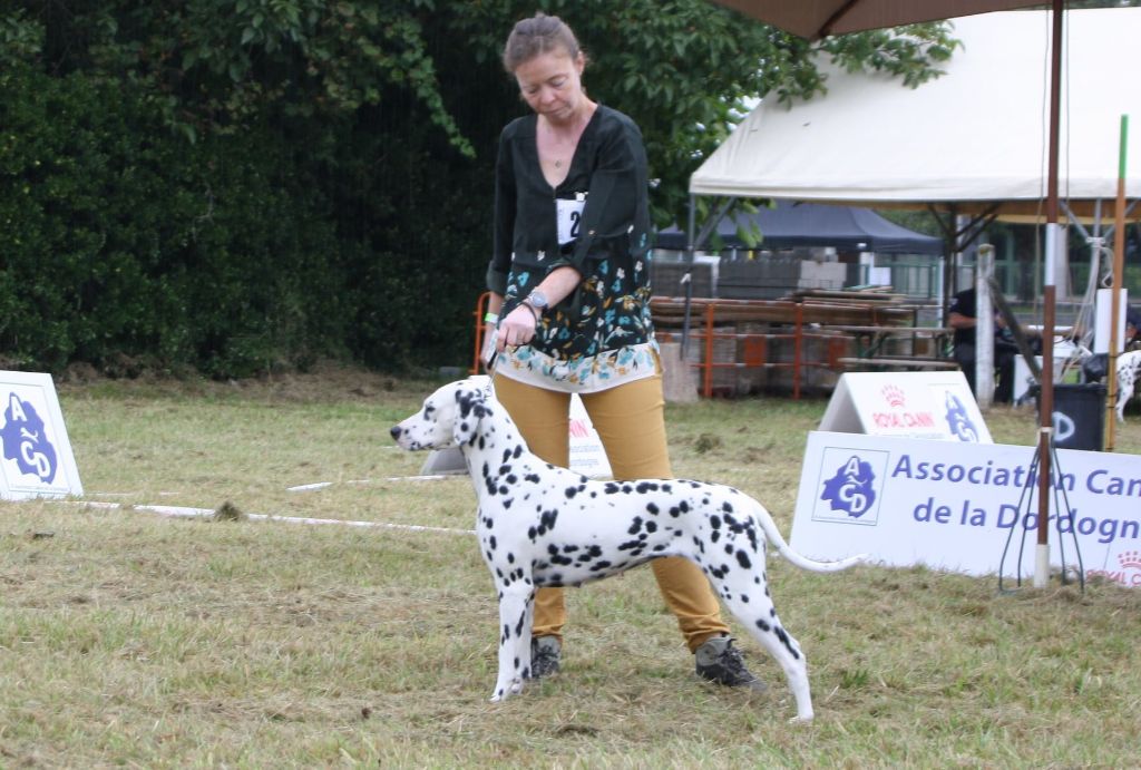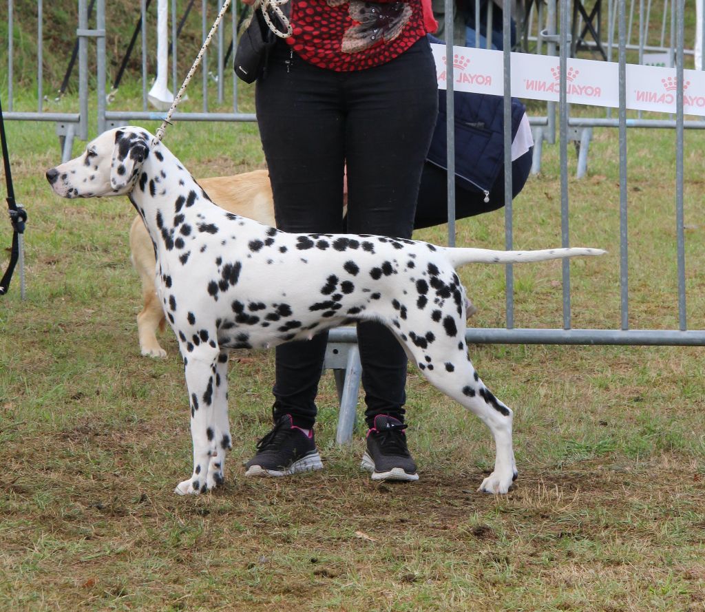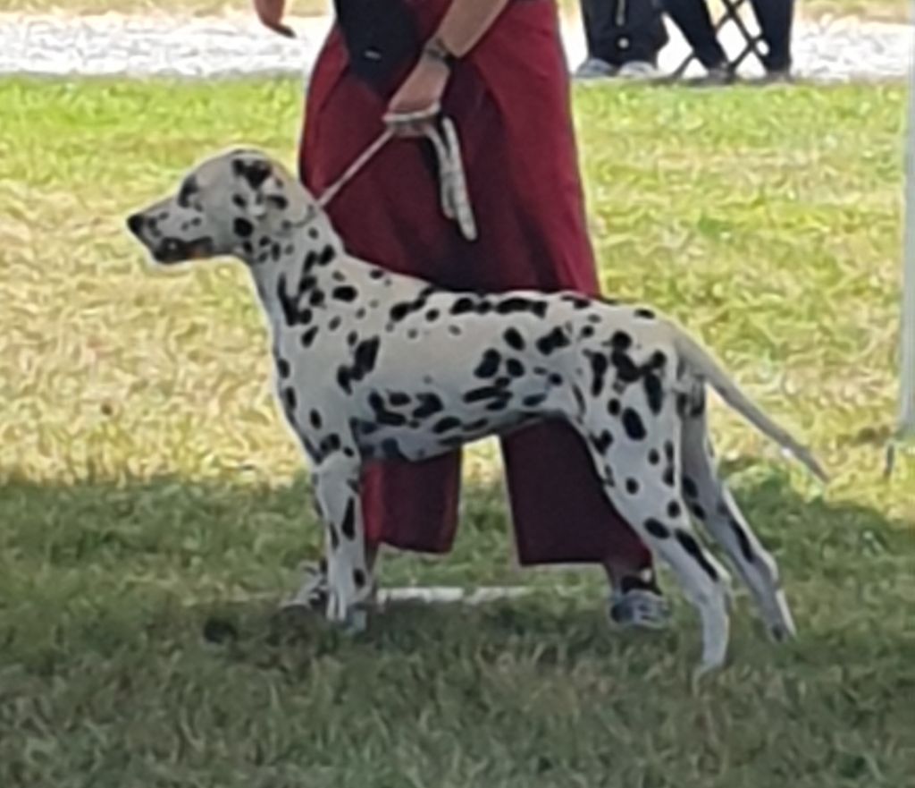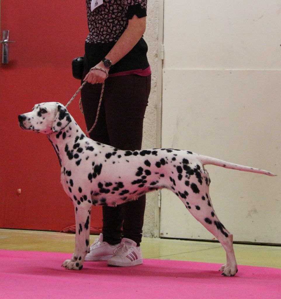 Bonne mâchoire. Bon crâne. Bonnes attaches d'oreilles. Chanfrein bien droit. Bonne avant main avec bonne ossature. Poitrine bien descendue. Dos pourrait être plus rectiligne. Bonne croupe. Arrière main bien angulée. Bien musclée avec bonne attache de queue. Quelques tâches confluantes. Bonne poussée. Démarche régulière.