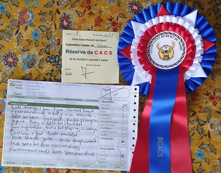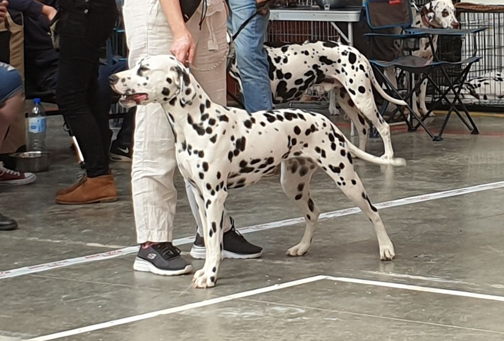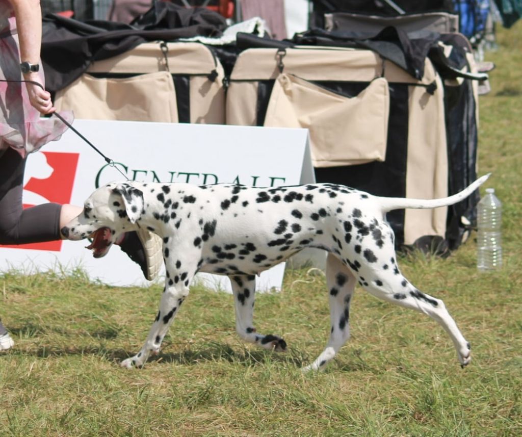 Manque P3 Supérieures droite et gauche. Excellent crâne, stop. Oreilles bien insérées. Encolure excellente. Queue bien insérée. Poitrine bien descendue. Épaule un peu droite. Bonne angulation arrière. Excellent pieds. Poils blancs dans les tâches noires. Très bon trot.