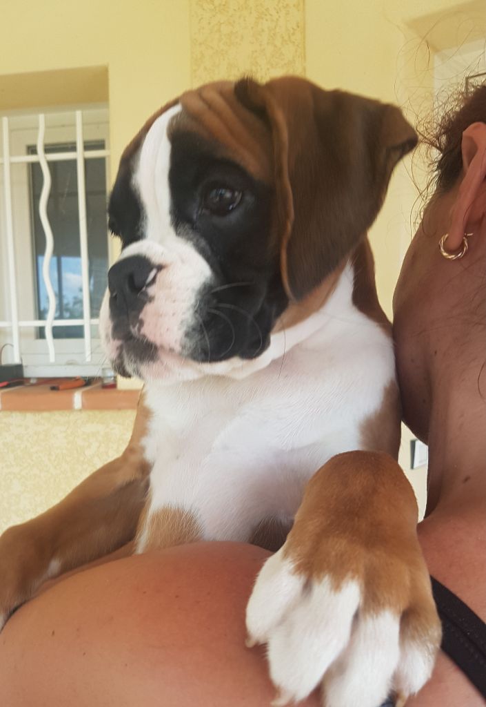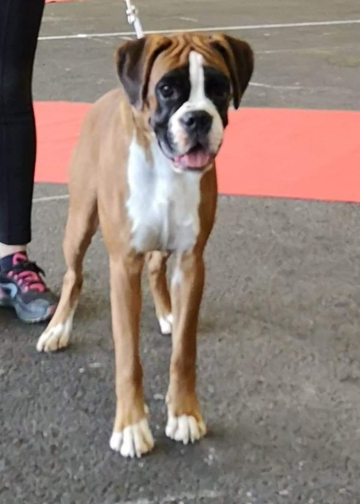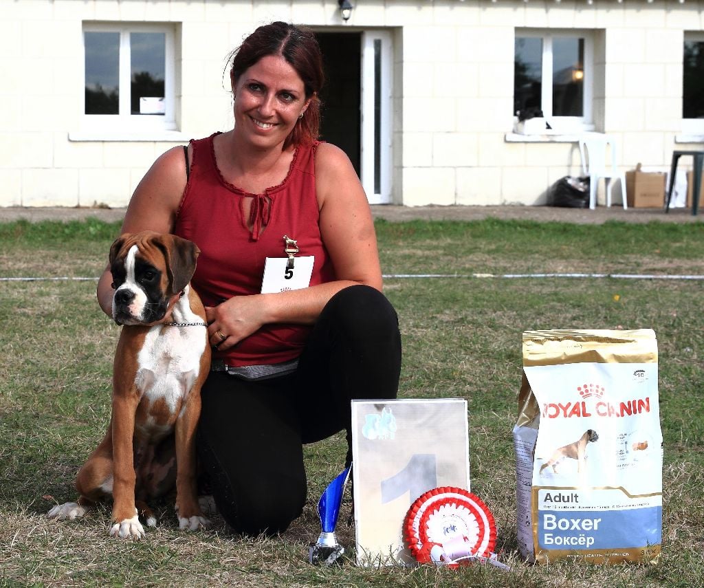 4 mois - Fauve rouge marqué en blanc - Bonne ossature et substance - Exc tête typée avec très jolie expression - Stop et menton marqué - Exc rapport crâne/museau - crâne légèrement ridé - Oeil foncé - Denture presque large avec Exc prognathisme - Belle sortie d?encolure - Exc angulations AV et AR - Exc poitrine et poitrail - Bon dos - Reins très légèrement long - Exc allures juvéniles
