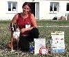 8 mois - crâne cubique et étroit - TB tête ciselée - oeil foncé bien positionné, belle forme - Exp féminine - Stop menton marqué - Narines ouvertes - Denture moyennement large alignée avec très légère déviation - Encolure dégagée - Construction presque carrée montente et féminine - Ossature moyenne - Poitrine aux coudes - Port de queue timide - Exc Ang Av et Ar - Allures libres