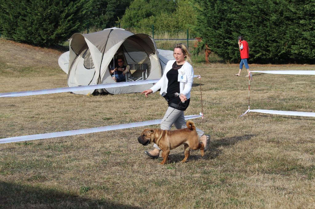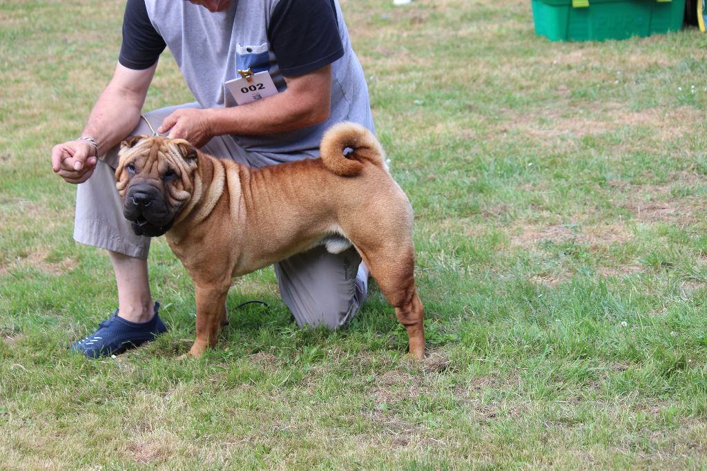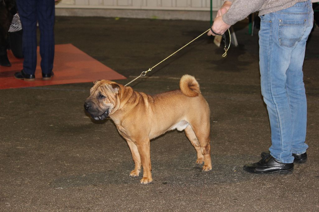 Excellente mâchoire ciseau, brush coat, bonne construction générale avec garrot plongeant et plissé, angulations typiques pieds de chat, fouet en anneau toujours bien porté, bonne encolure avec fanons typiques, très jolie tête, bien ridée et plissée, crâne plat petites oreilles bien portées, museau hippo, bon oeil et pigmentation, bonne longueur museau, démarche correcte.