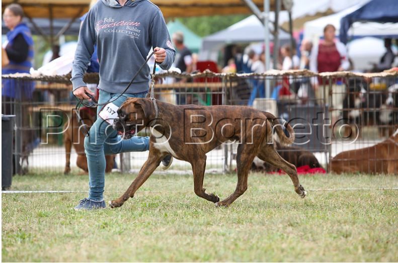 Classe ouverte mâle bringé : GD modele. Bon volume de tête . Museau un peu court. Prognathisme correct. Belle ossature et arrière main . Belle épaule . Ecrase un peu les pieds. tbelle couleur de robe . Très joli mouvement et belle couverture