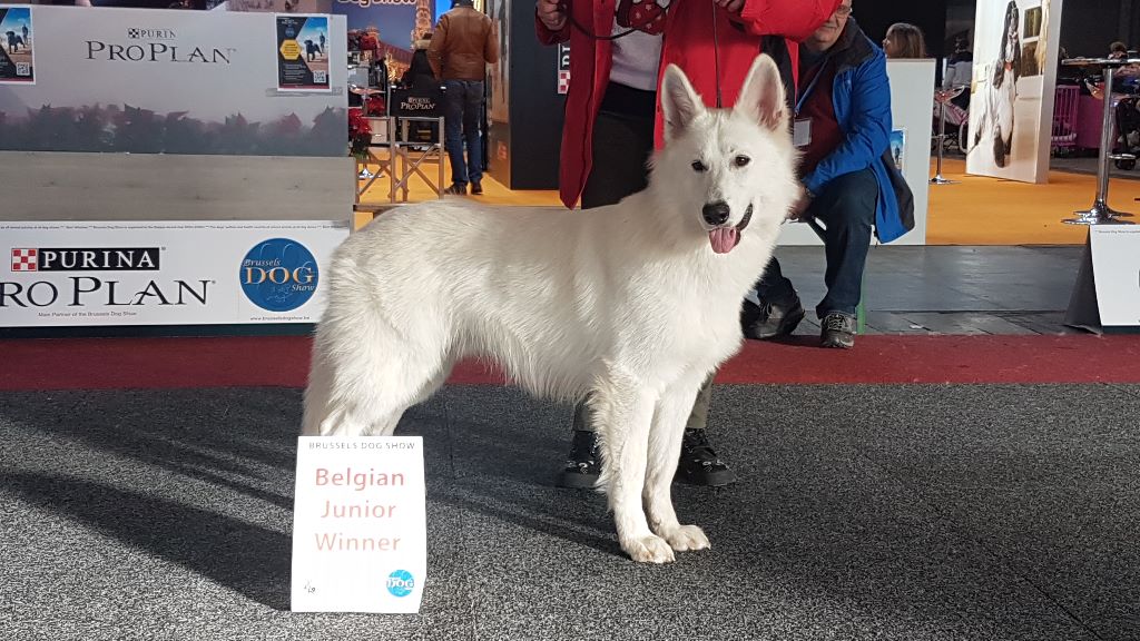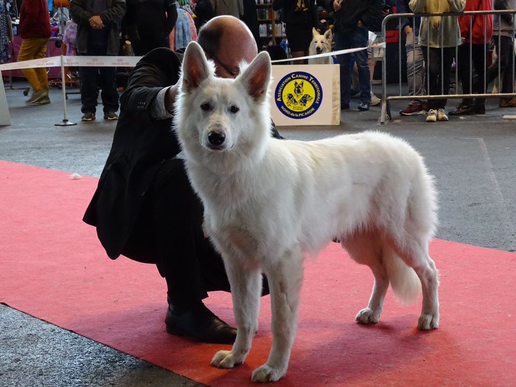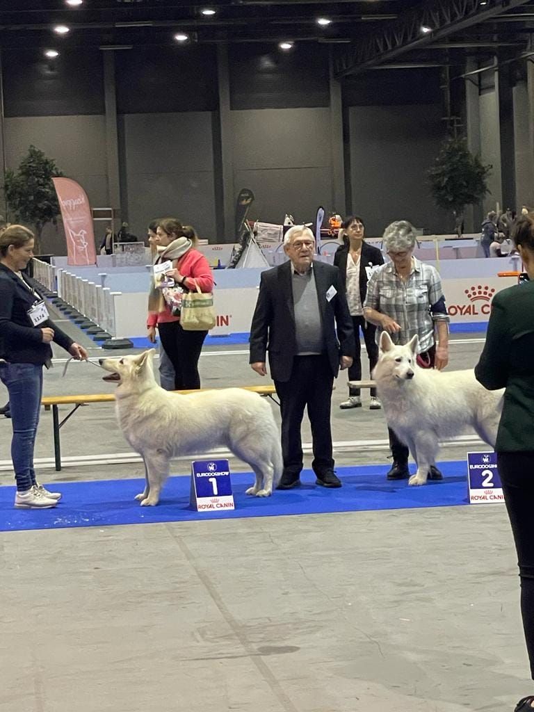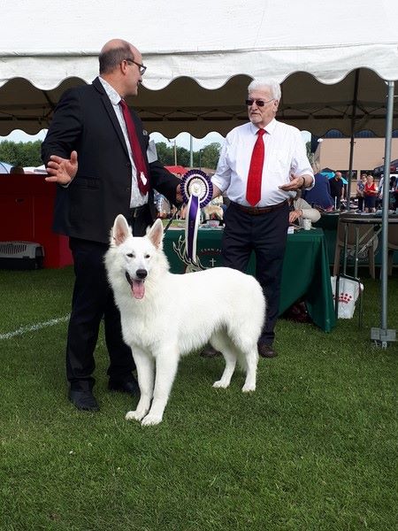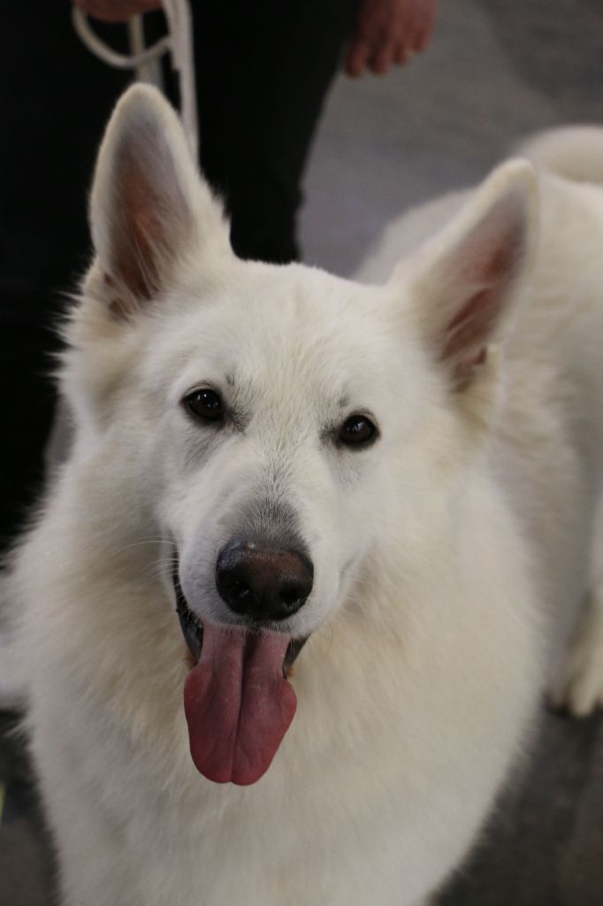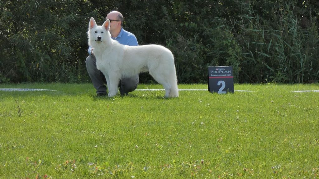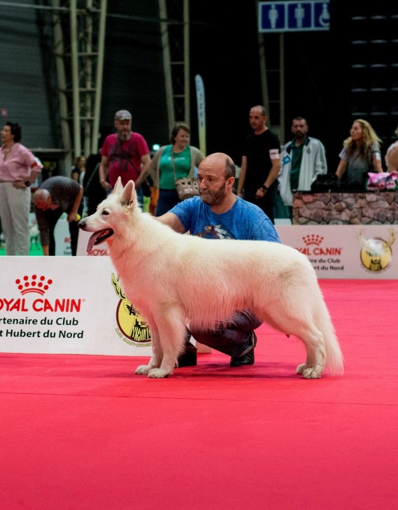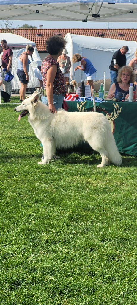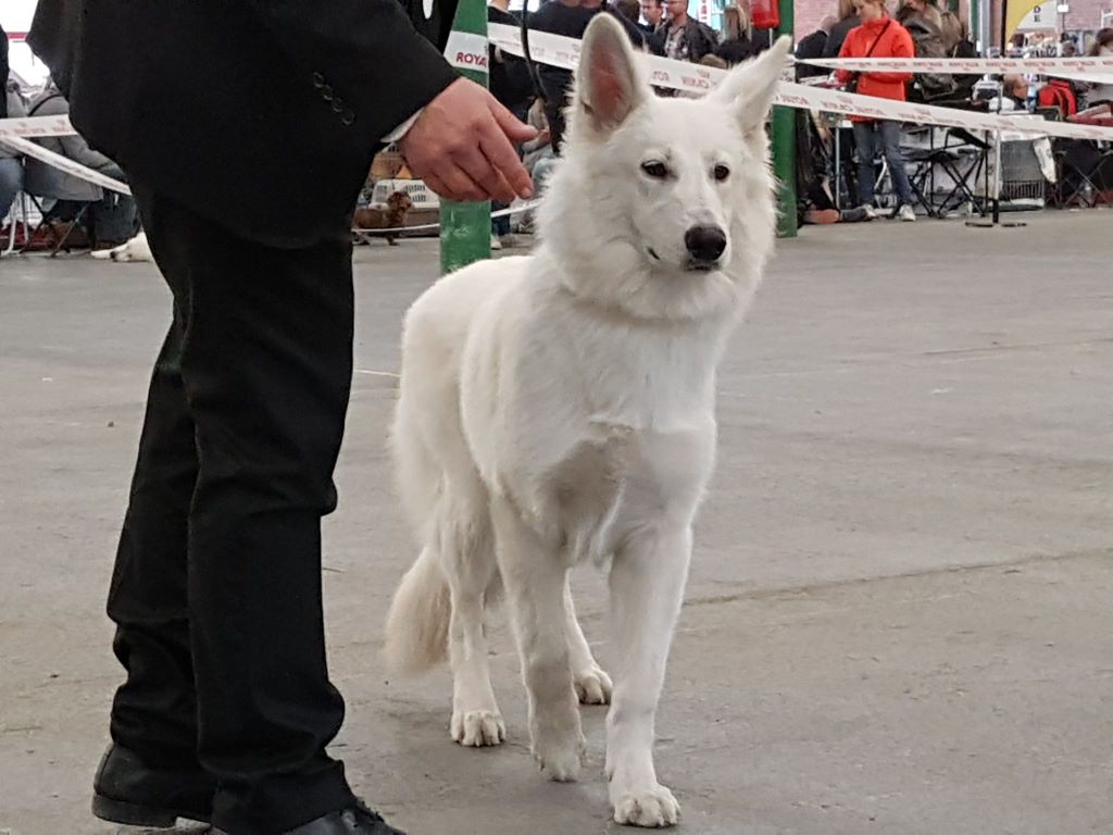 Sujet sympathique, très jolie tête, bel ?il, très belle couleur, excellente attache d'oreille, belle poitrine, pigmentation intense, sujet avec substance, belle sortie d'encolure, ensemble corporel termine sa maturité, construction d'ensemble avec mouvement régulier Meilleur Jeune mâle, Meilleur Jeune et Meilleur de race et 2ème au GROUPE 1 sur le Ring d'honneur Wolf confirmé avec succès