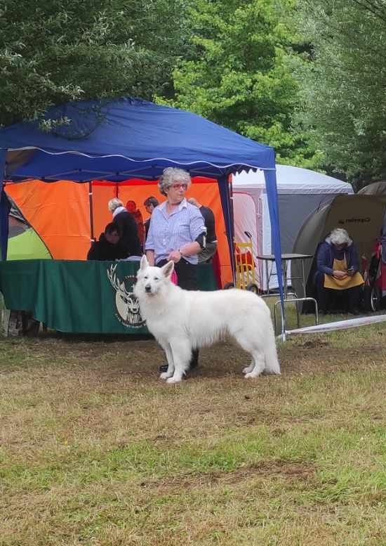 Joli bébé, belle taille et ossature, museau et crâne bien proportionnés, grandes oreilles bien placées, excellente pigmentation, belles angulations avant, ligne de dos droite, croupe descendante légèrement, queue longue, tres belle démarche, coudes légèrement décollés, excellent poil et présentation