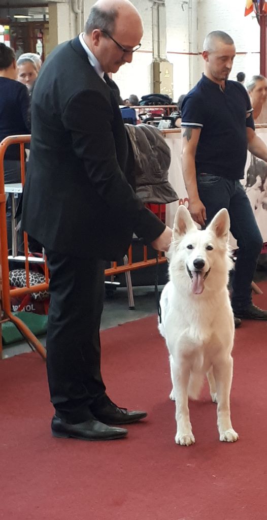 Sujet un peu contracté à l'examen individuel, jolie tête, ?il de belle couleur, bonne paupières belle pigementation, excellent articulé, belle sortie d'encolure, sujet à substance osseuse bien que féminine, belle épaule, arrière main bien construit Meilleur Jeune Femelle et BOS ! Only a été confirmé avec succès