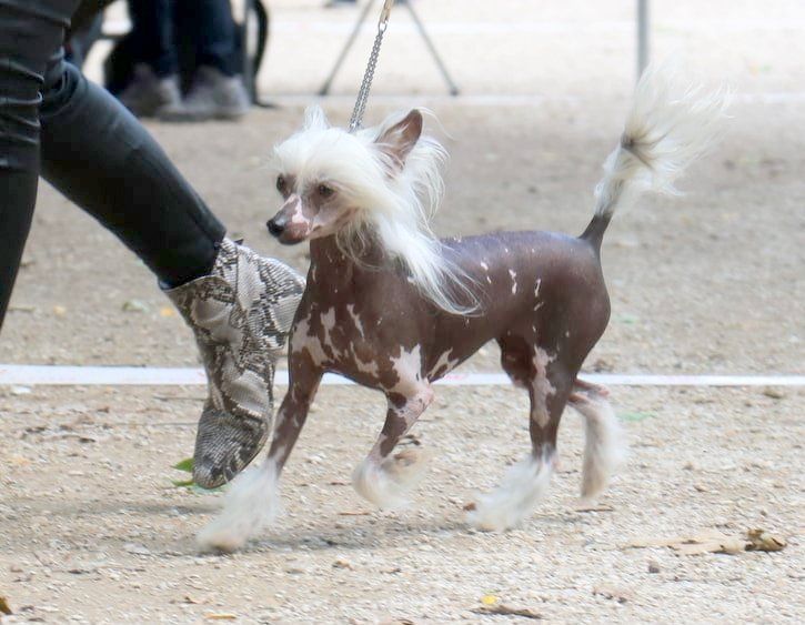 Très jolie tête, exc rapport crâne/chanfrein, exc yeux, forme et couleur, exx pigmentation, exc articulé, exc poitrine, AV et AR main, épaule, angulations, ligne de dos, attache et longueur de queue, pieds de lièvreExc démarche, queue portée gaiement